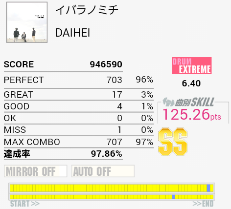 ギターはあと50で青グラ。5台の稼ぎ曲を探せば紫を狙えるかも……?BASSだけでそんなにあるのかは知らんけれど。RAISE MY SWORDのEXT-Bをやって大変な目にあったので右手を鍛えたい。