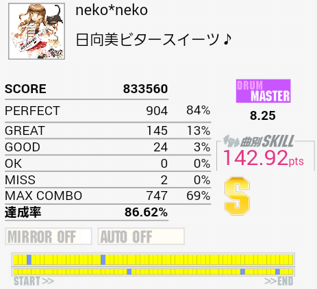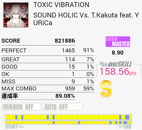 S出ない。刻みながらの連バス、左手でHHを叩くのがいまいち。そこをできるようになればラストのdkdkまで繋げられる……といいな。