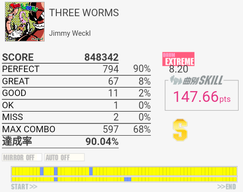 最初のdkdk後の三連符からの連打部分は繋がりはするようになってきた。でも全然パフェ率が上がらない。なぜだ。