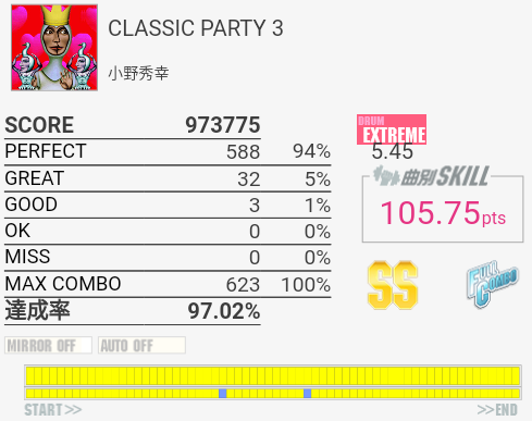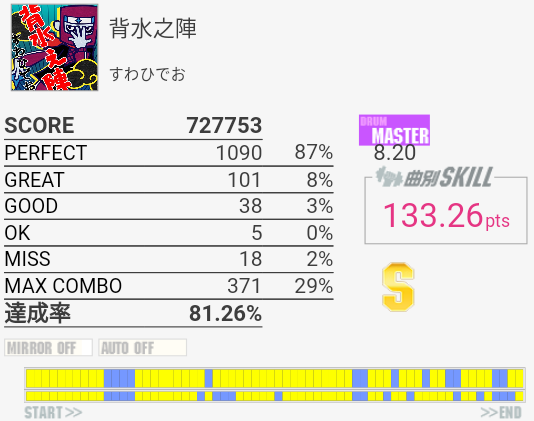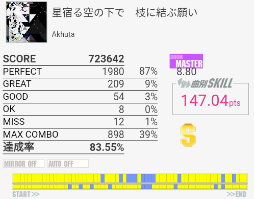 あぶねー、S出ないかと思った。意地の悪い譜面だと思ったらwac作曲なのか、納得。これ流氷の去りてなんかよりよっぽど難しいよね?真ん中ちょい前らへんはオープンができるとちょっとは楽だろうなあ。