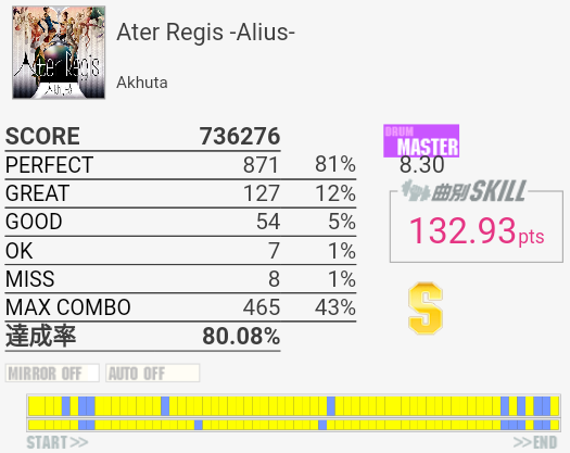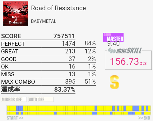 初見B判定でした……(小声)苦手なタム+ダブル多様譜面で苦しい。S取れたのは奇跡だわ。イントロとアウトロのSN連打が全然見えないしそもそも追いつかなくてずっと16分連打してた。