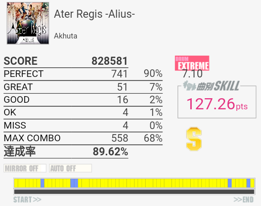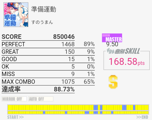 ようやくS判定取得で対象の下限に。サビ前のCY→SN×3で絶対切っちゃう。後半疲れてくるとやっぱりズレるなあ。