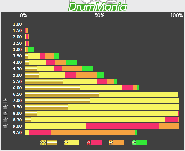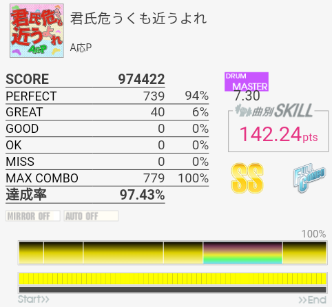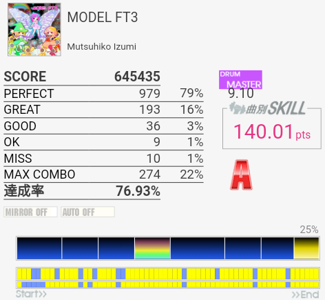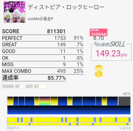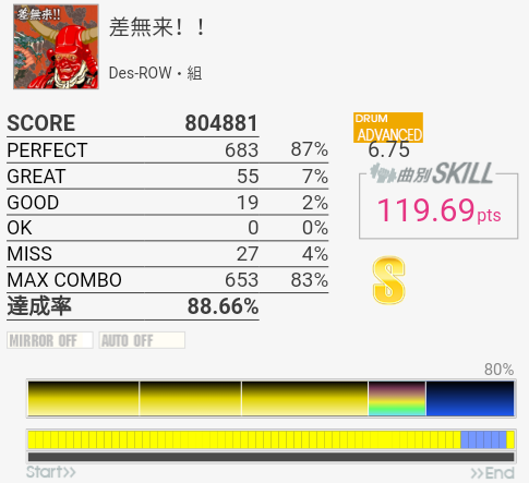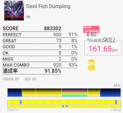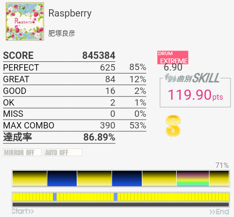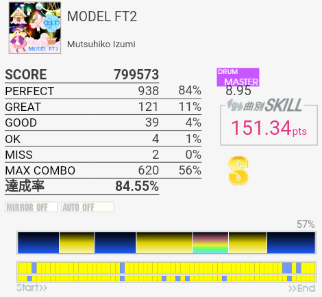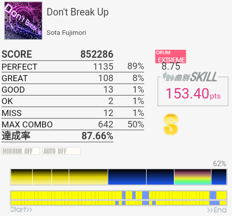 一見惜しいように見えるけれど3フレーズ目と最後のタムがクソ速くて叩けないので無理。パフェをちゃんと取れれば90%くらい行かないだろうか。