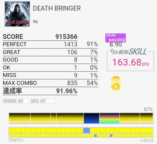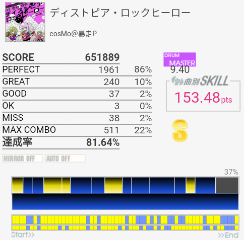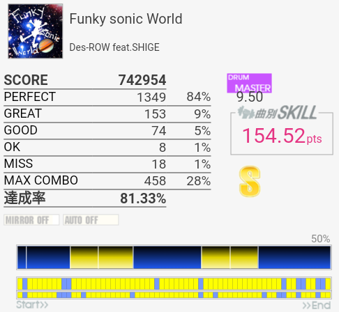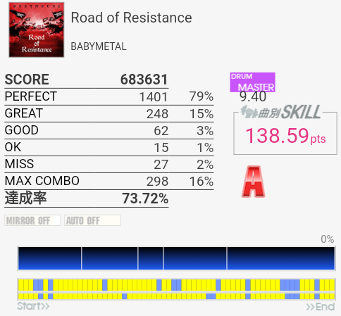 今作初プレイ。前作ベスト-1.22%。タムを覚える気がない。まずシングルで回るのから叩けるようにしたい。