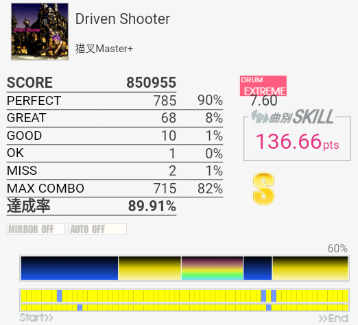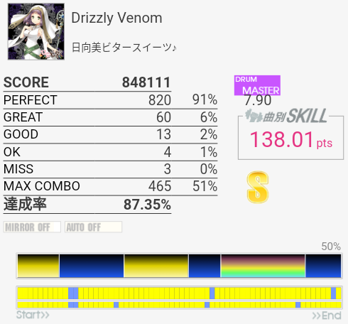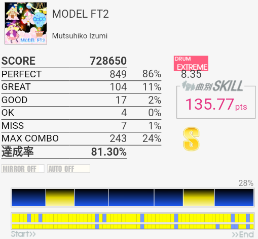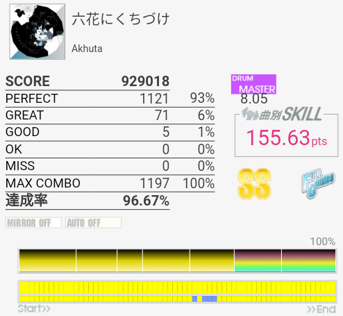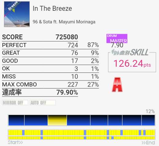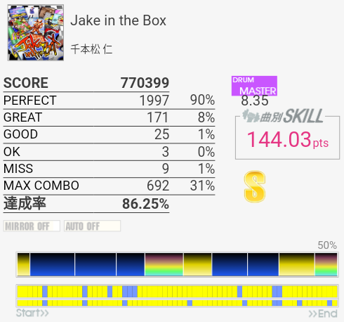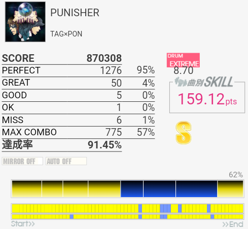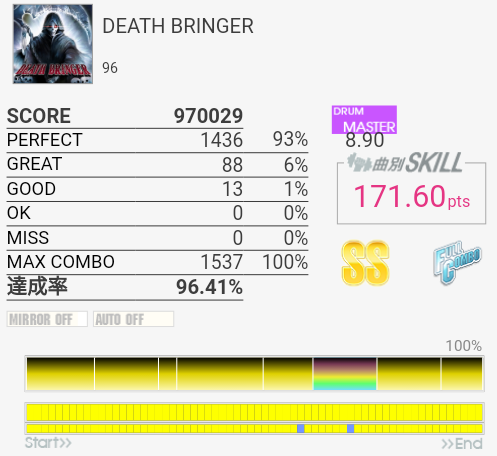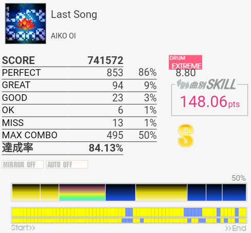 タムが簡単になってないかなーと期待してみたけれどそんなに変わってなかった。同色タム×2だからダブルで取れればいいのだけれど。ちょくちょくHTがLTに変わっていて、特にイントロはMASより難しい。