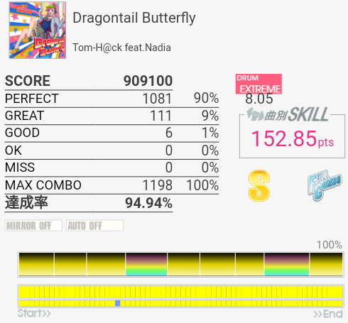 ようやくフルコン。初170点台!!やっぱホームの筐体はやりやすい。繋がらない時はP率95%くらい出るときもあったけれど、ひとまず。スキル横の色が虹色になっているのを見て、当たり前だけれど虹ネームって遠いなって。