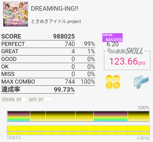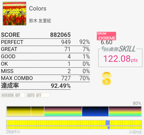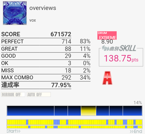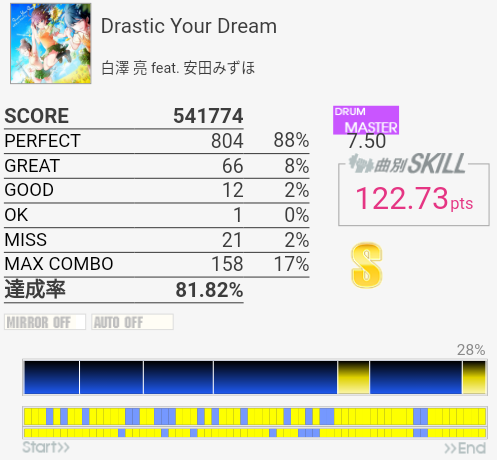 初見フルコン。エクセできそう。パフェが出やすいBPMなのだな。最初とサビ終わりの8分連打とサビ前のタムが適正だと切りやすそうかなあ。何気に刻み中にけっこうCYに振られるのも厳しいかも。音を聴くとイントロとアウトロのSN×3になっているところは簡略化されているのかな。そのまま譜面にしてよかったと思う。