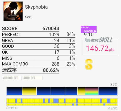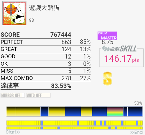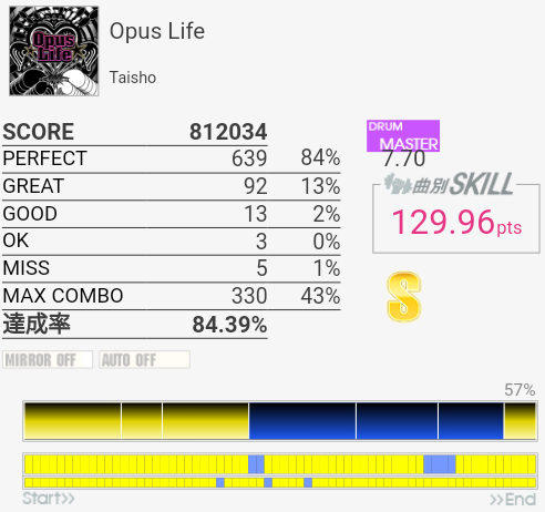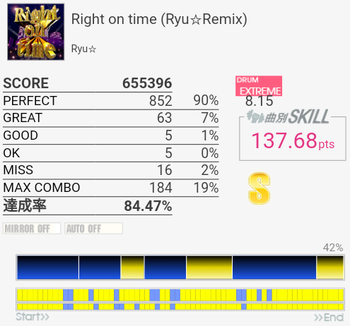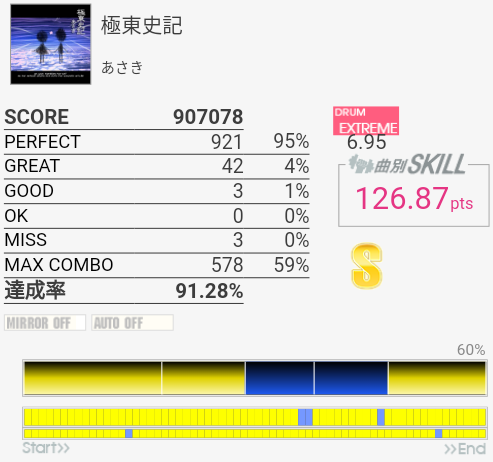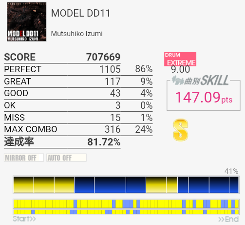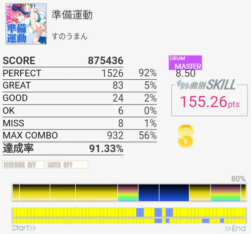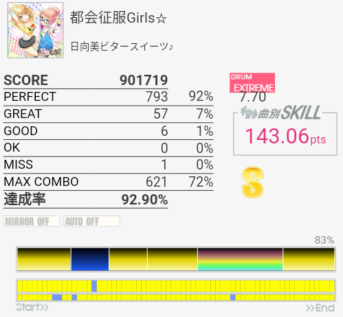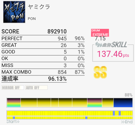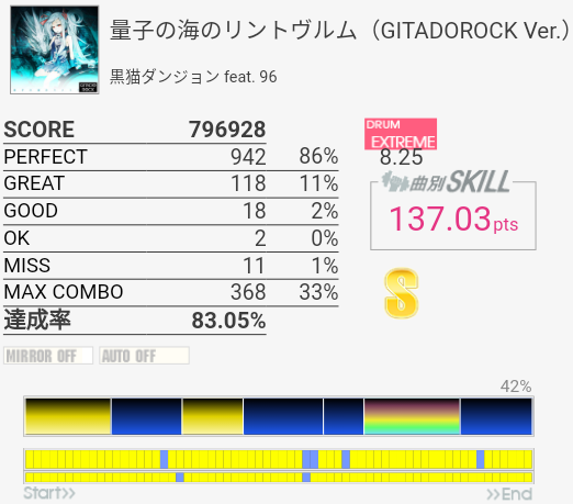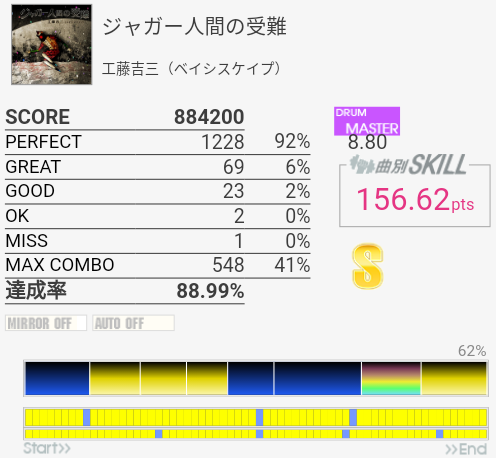 今回は比較的マシだった。というかサビ前が綺麗に叩けたのは初めてじゃないかな。それはそれとして初っ端のSN連打が全然ハマらない。