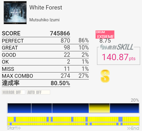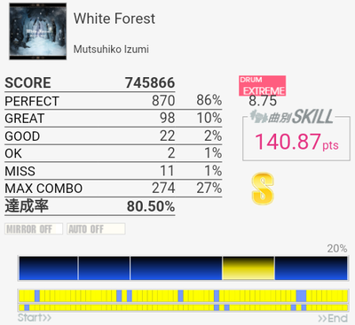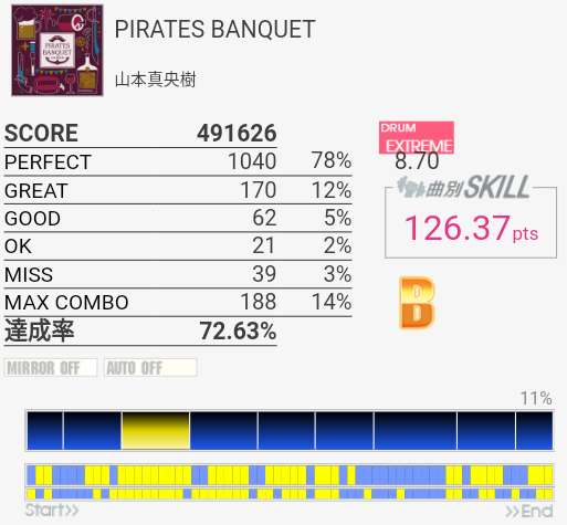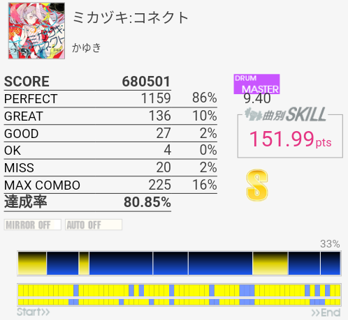 最後のフレーズを繋げばA判定は出るな(白目)。サンバキック部分はSNは見ないでCYと同時に叩くことで乗り切っている。序盤のフレーズは左手が裏表ダブル入り混じって崩れまくるのでそこからだね。曲のノリを理解できれば勝手に動きそうだけれどもなー。