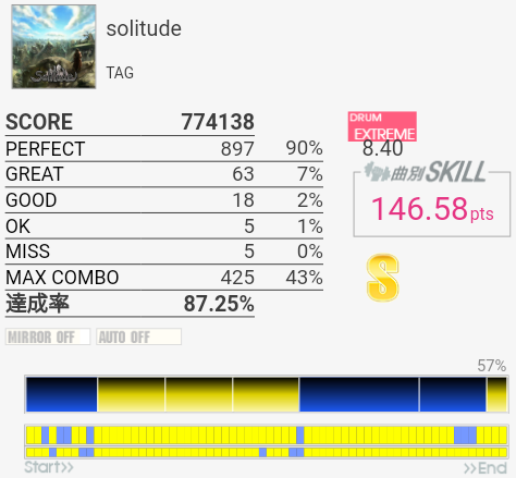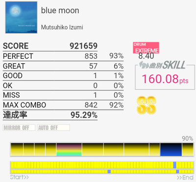初見でフルコンはできなかったけれどSS取得。変な譜面。タムに振られて同時ってのが多いのでそれ次第か。何気にイントロのフラム絡みが難しかった気がする(ダブルで取った)。
