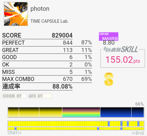 非常に惜しい。でもSS取れたし160点ついたのでよし。前作までの計算でもこのくらいならSS出たよね?(うろ覚え)逆タム三回目のHTかLTをスカったのかなあ。とりあえず心置きなくMASをできる。