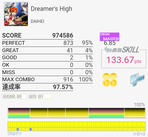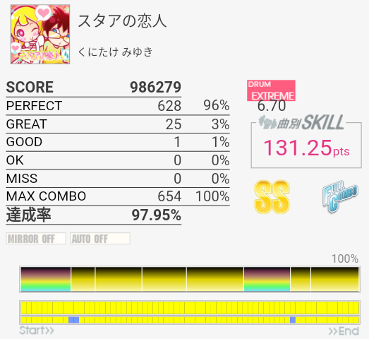 今日はスコア稼ぎを兼ねて6台後半からフルコン狙いでプレイしていった。ギターやると右手に力が入りすぎてドラムできなくなるし。