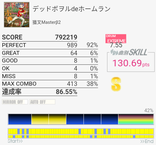 フルコン。細かい連打は出口でダブルを使う取り方。追い越しタムも全く忘れていたけれど反応できてよかった。Excavation Damageとかより先に繋がるとはなあ。