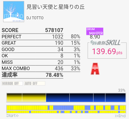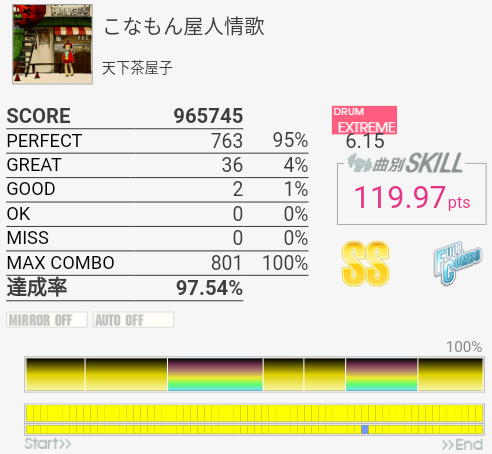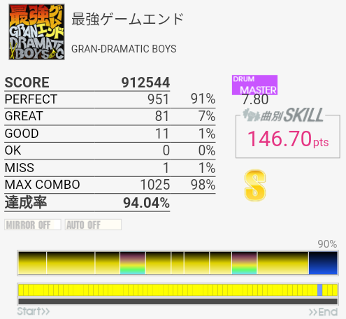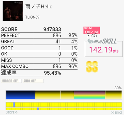 SS取得。HH×3みたいな連打はこのくらいのBPMがギリギリって感じ。力が入り過ぎている。