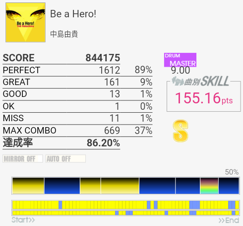 DEATH BRINGERはhiratyさんならあっさり抜かせそうですが……(笑)スキルで負けていても達成率で勝っている曲は何曲か作っておきたいですねー。今作金ネームはいけるんですかね、Other枠が平均160後半ないと厳しいので、今の感じだとまだまだですねー。伸び悩んでます。以前できたことができなくなっていたり、まあ気付いたら狙えるって感じになるまではあまり意識しすぎないようにしています。