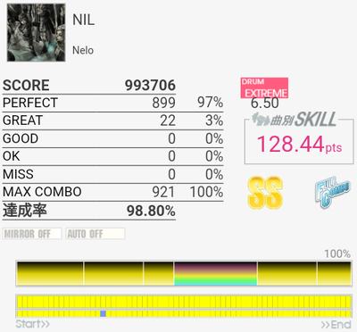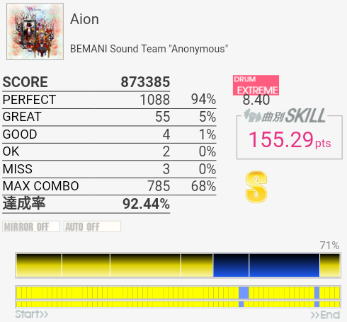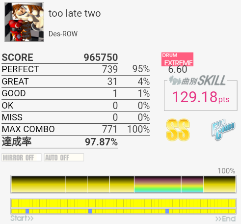 フルコン。HT×3とかばかりなので苦手。譜面を全然覚えていないので両手タム連打もよく反応できたと思う。