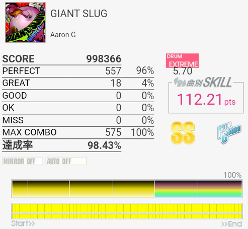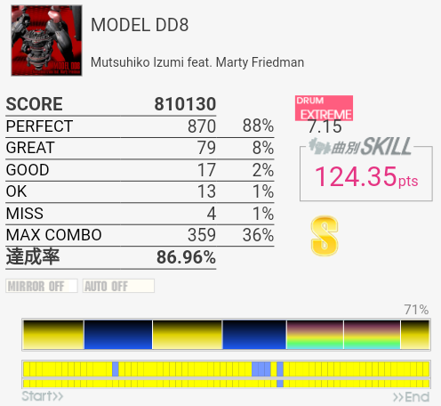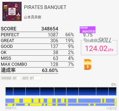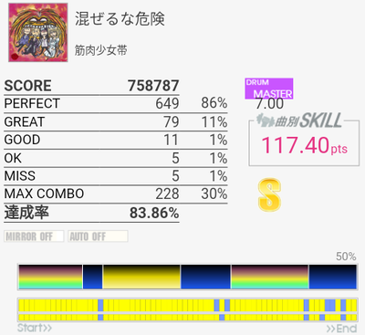MASはC判定→B判定。ギリギリ。他の山本真央樹曲よりは8分LPを合わせやすい速度のようなそうでないような。サンバキック地帯でSNを合わせるのを捨てないと落ちるので練習でやるのはちょっと厳しい。