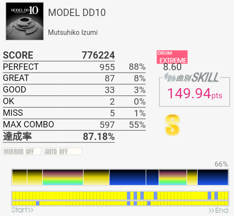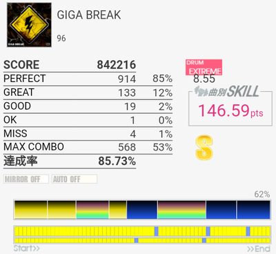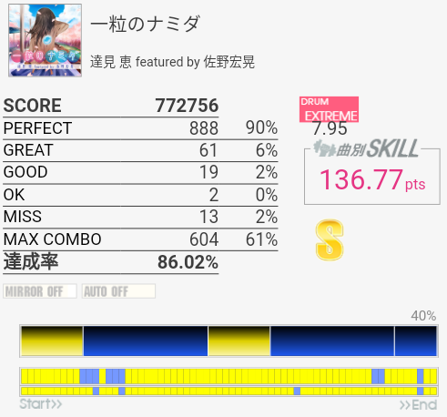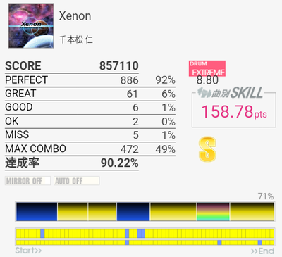 伸びそうに見える譜面。理接ではある……のか?どこで切ってもおかしくないのでMISS数ほど上手く叩けている感じでもないなあ。