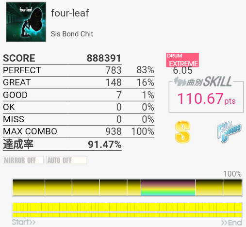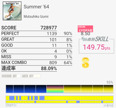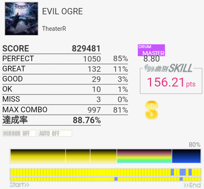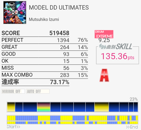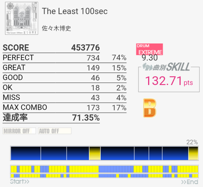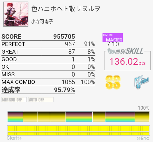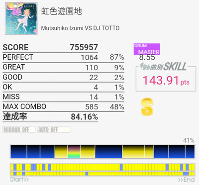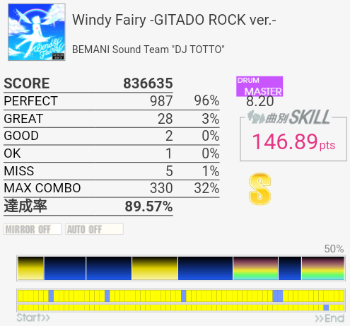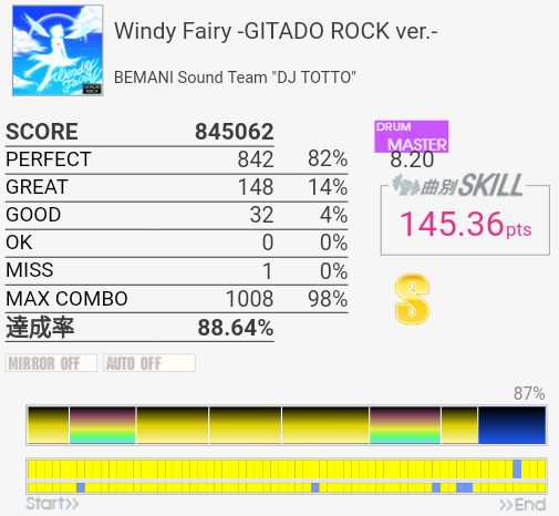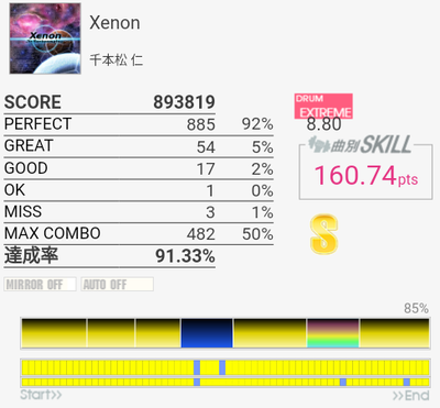 上がおかしい筐体で下がXG筐体でのプレイ。上のコンボで下のパフェ率なら96%くらい出てたと思うんですけど(泣)イントロのクソ速いSN連打と、LT×2→FT×2→CY×3が大きな切りどころだろうか。何気に右手は叩きっぱなしだしHHから左右に振られたりするのでけっこう疲れる。シンバルからの16分連打も多いので、繋がらないことはないけれど1切りとかが多発しそう。でも難度値は甘めで8台はないと思う。