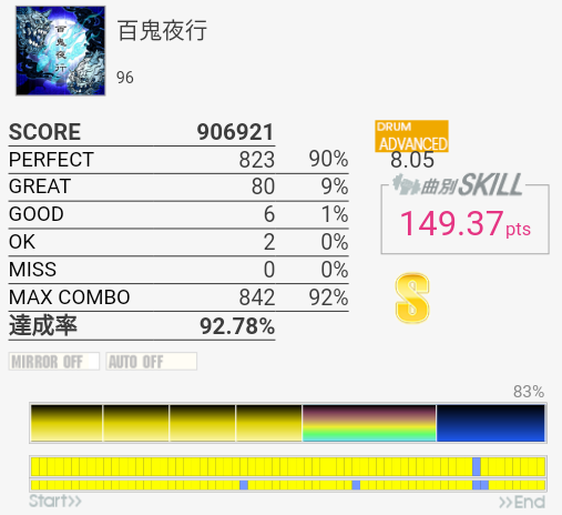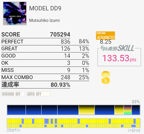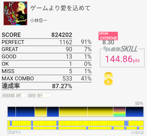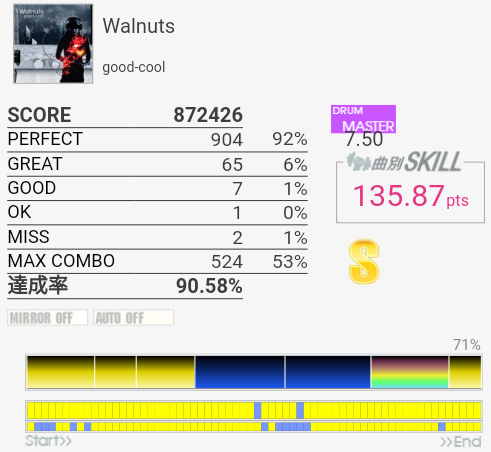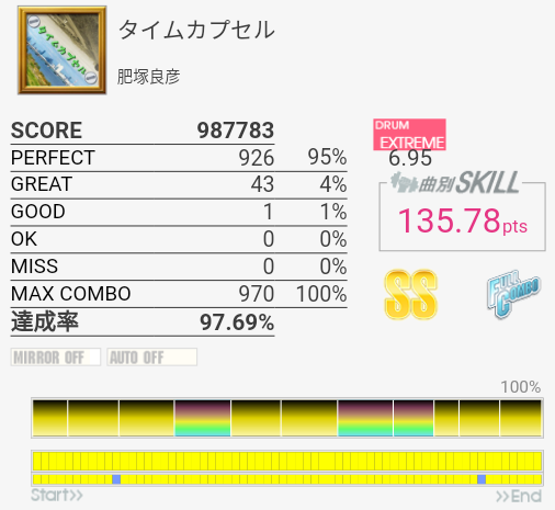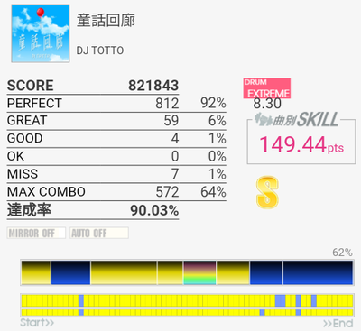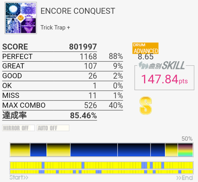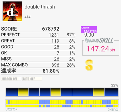 惜しかった。SN→HT→BP→HT→LT→BP→……部分の入り方が毎回うまくいかないな。あとこのパフェ率じゃ繋がっても160乗らない。MASはS判定が取れない。