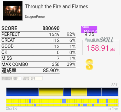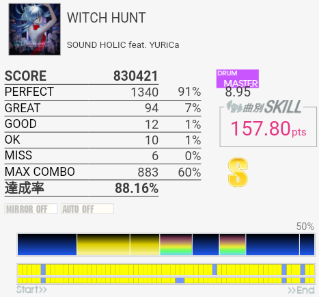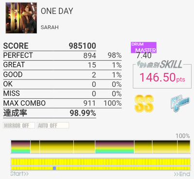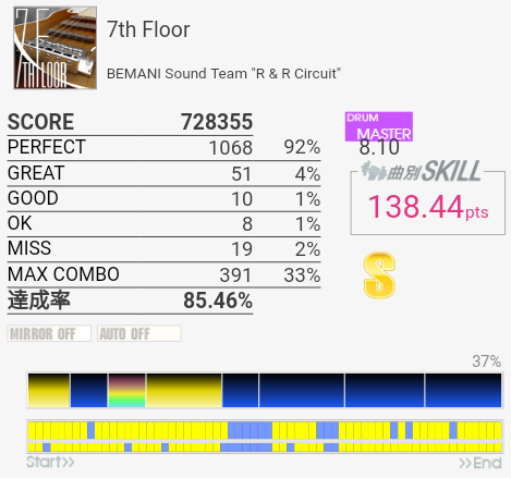 フルコン。癖は抜けていたけれど一部の譜面を忘れていたのでGOODが出たのが惜しいな。