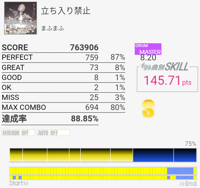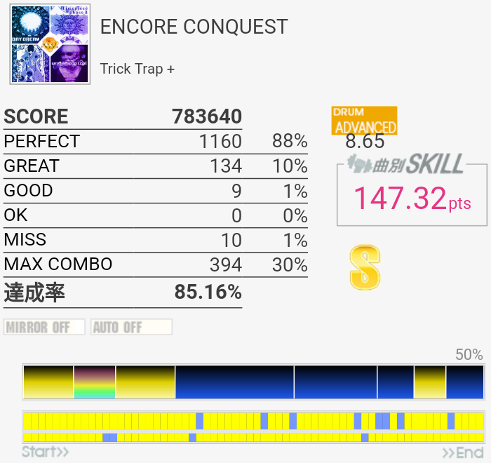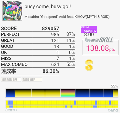 解読不能2回繋いだのに前回の達成率とほぼ変わらないとか。筐体のHHとCYの反応が微妙に遅くてパフェ率90%行けばいい方だった。ギタコンもビスが取れてて天板が浮いていたけれど店員に言い忘れた。