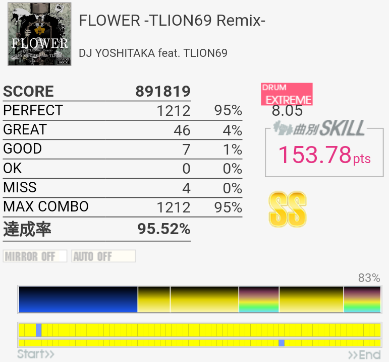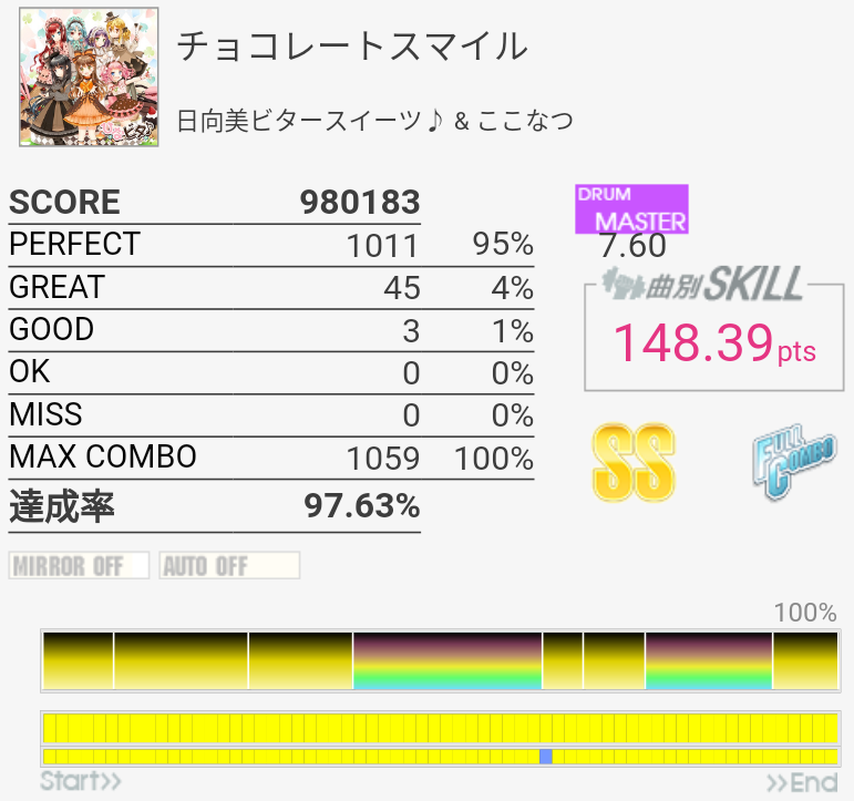 フルコン。この譜面でこのパフェ率は低いと思う。でももう1切りで泣くのは嫌だ。