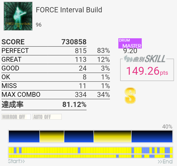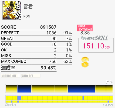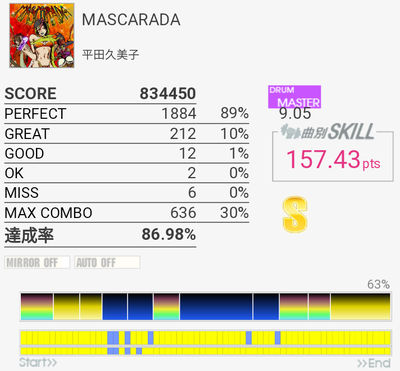 イントロのタム×3の打ち損じとサビのLT×4の頭の連バス抜け。このパフェ率だと繋いでも160超えないかなあ。