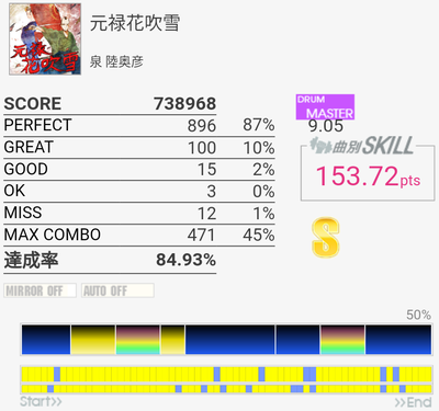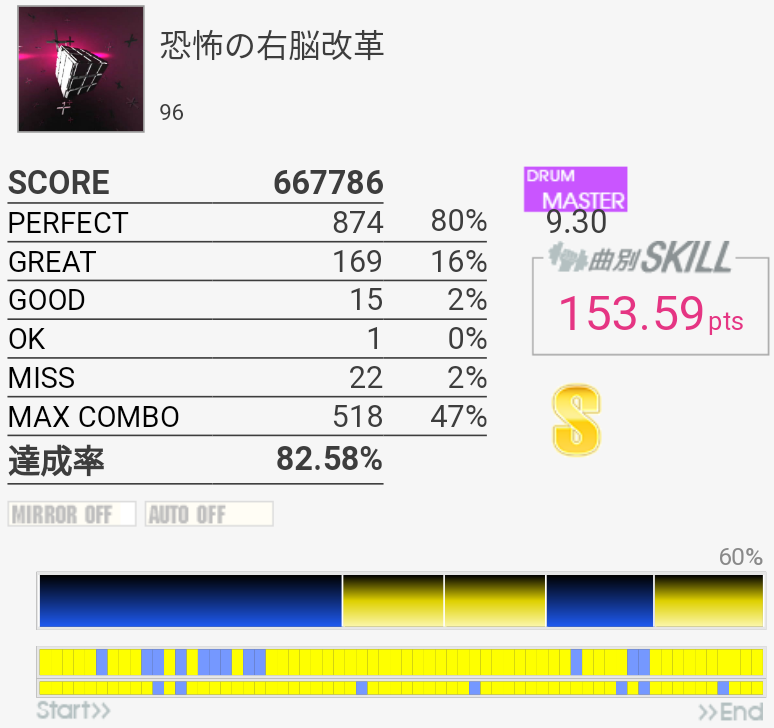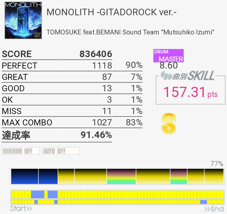 最初のフレーズ以外繋いだら160くらいだろうか(パフェ率)?EXTだと4フレーズ目あたりの手がちょっと回しづらくなっているので悩ましいよな。いずれにせよ最初のフレーズができなきゃダメそう。なんか以前と比べてBPが合わないのだよな。