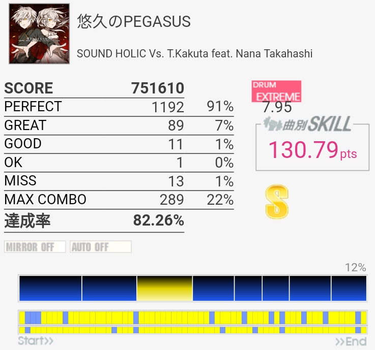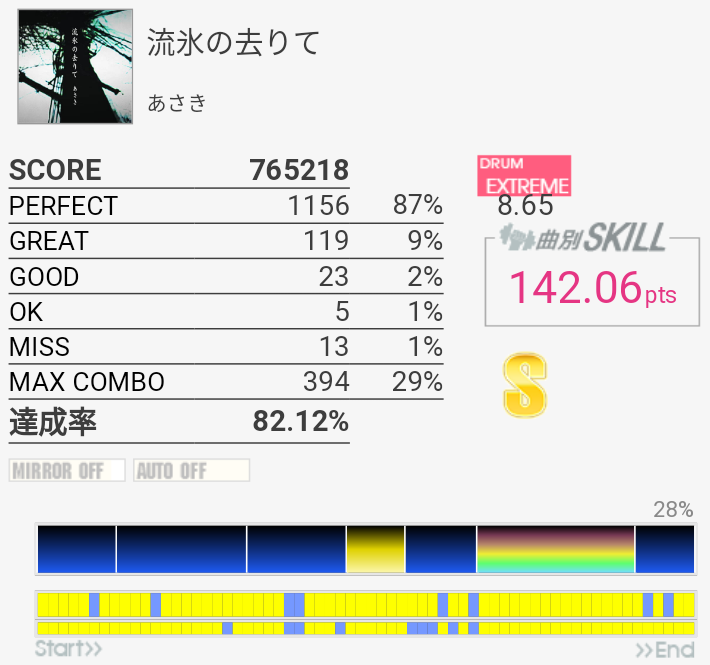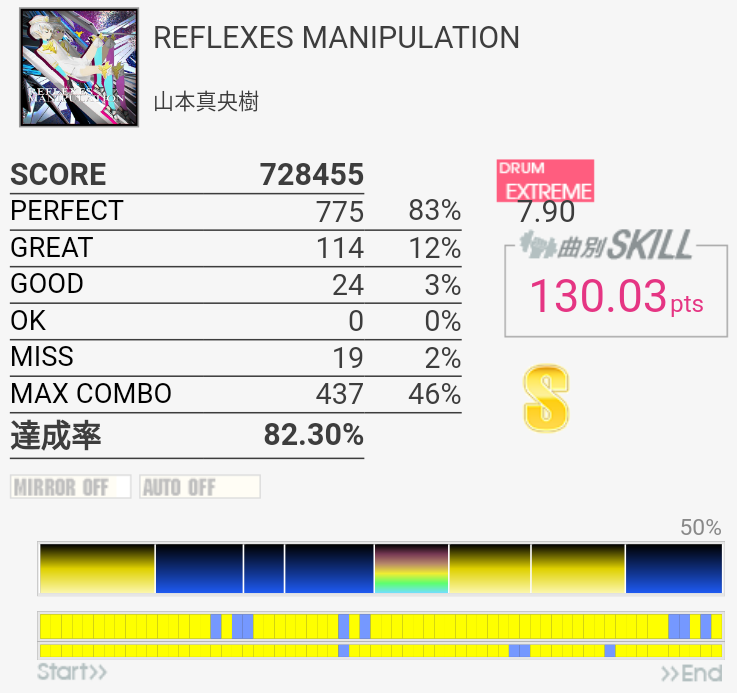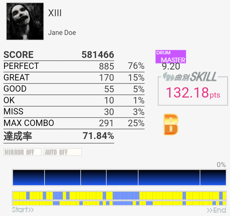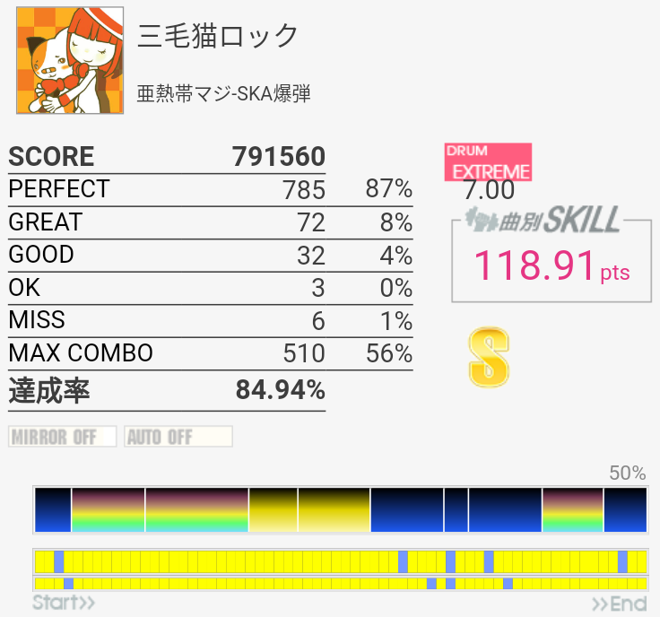 最近CYとLCをスカることが増えた。謎。触っていなかった曲が伸びたりすると少しは地力がついているのかなと思うけれど、7台でA判定が出たりするのでムラが激しい。7台でA判定はマジでヤバい。