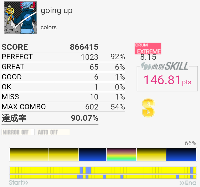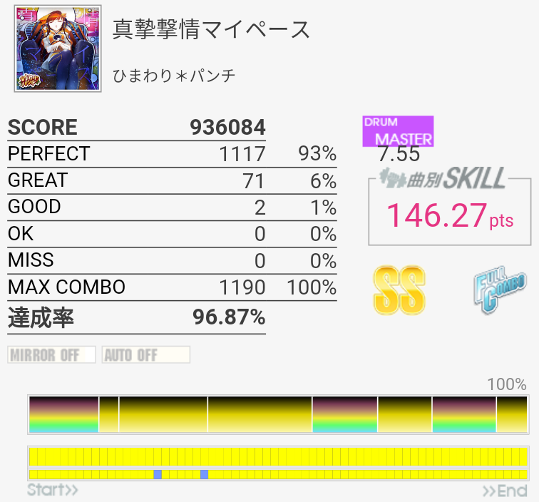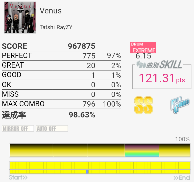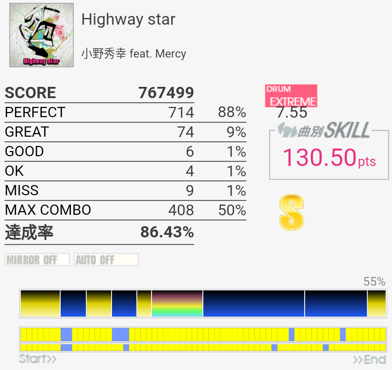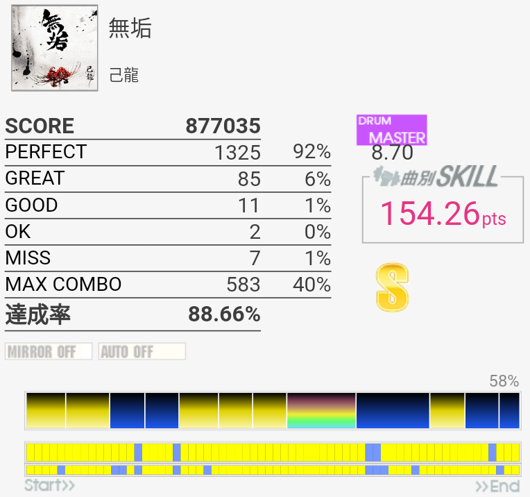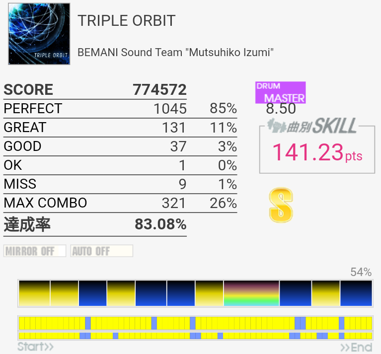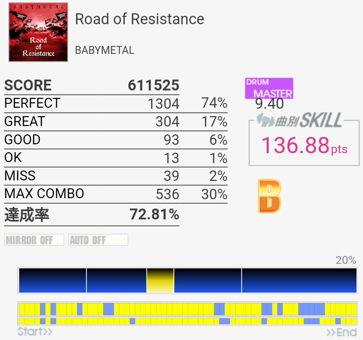 苦手な割にそこそこ叩けた、でもBメロの8分移動は追いつかない。