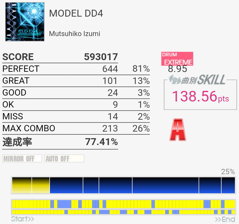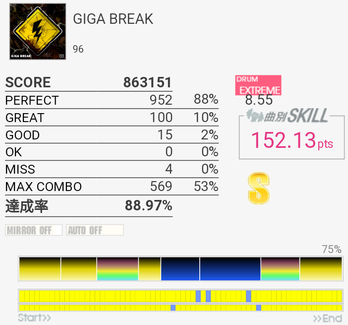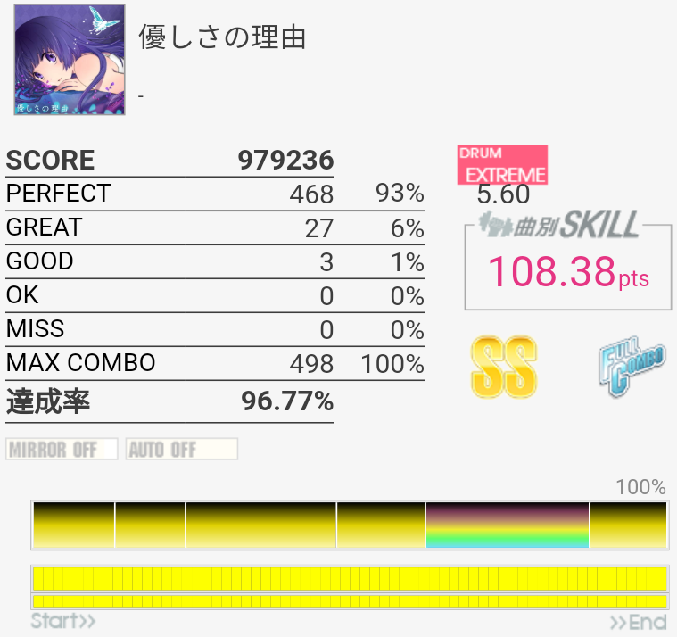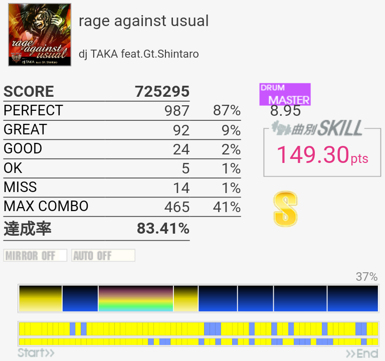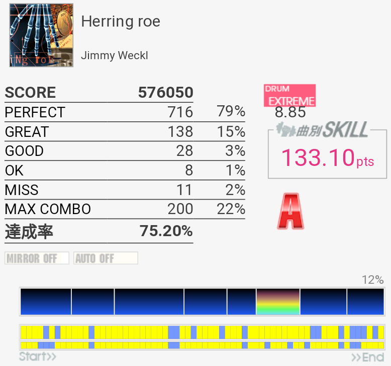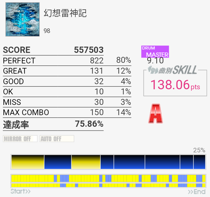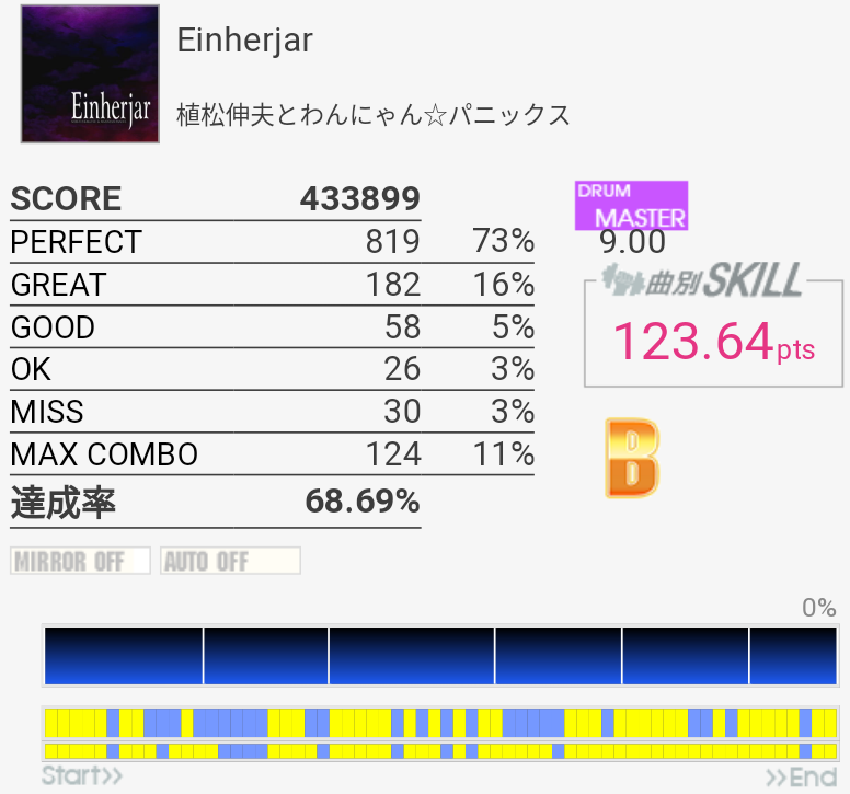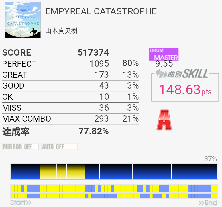 全然覚えていないのでゴリ押したらやっぱりこうなる。フレーズごとに二か所ずつくらいミスっているから潰していけばフルコンできるな!