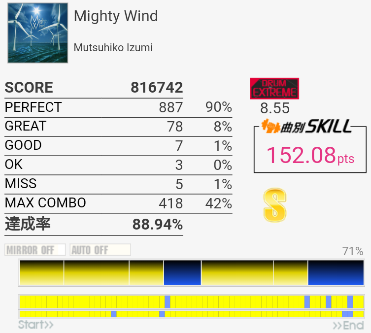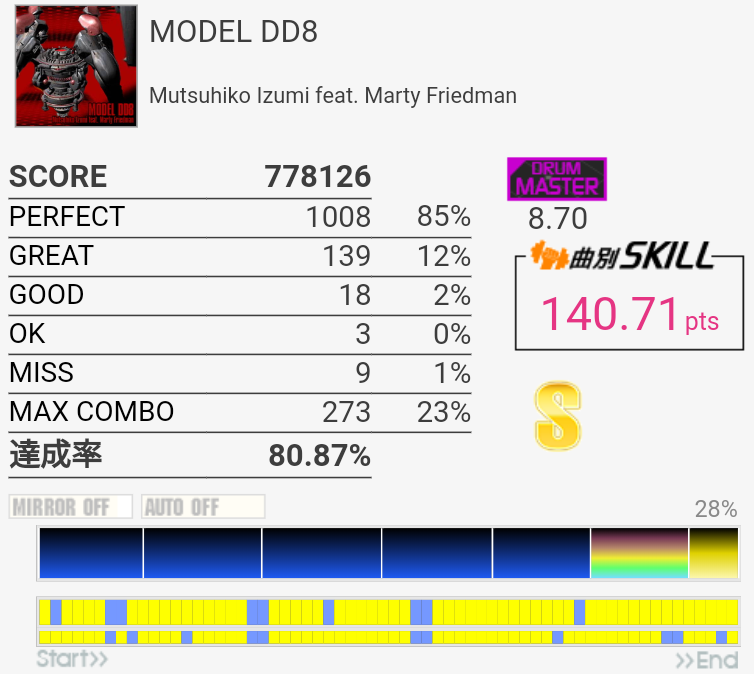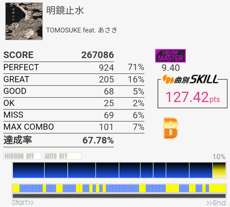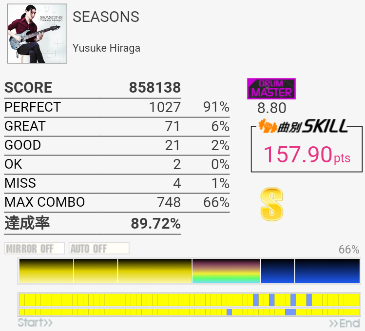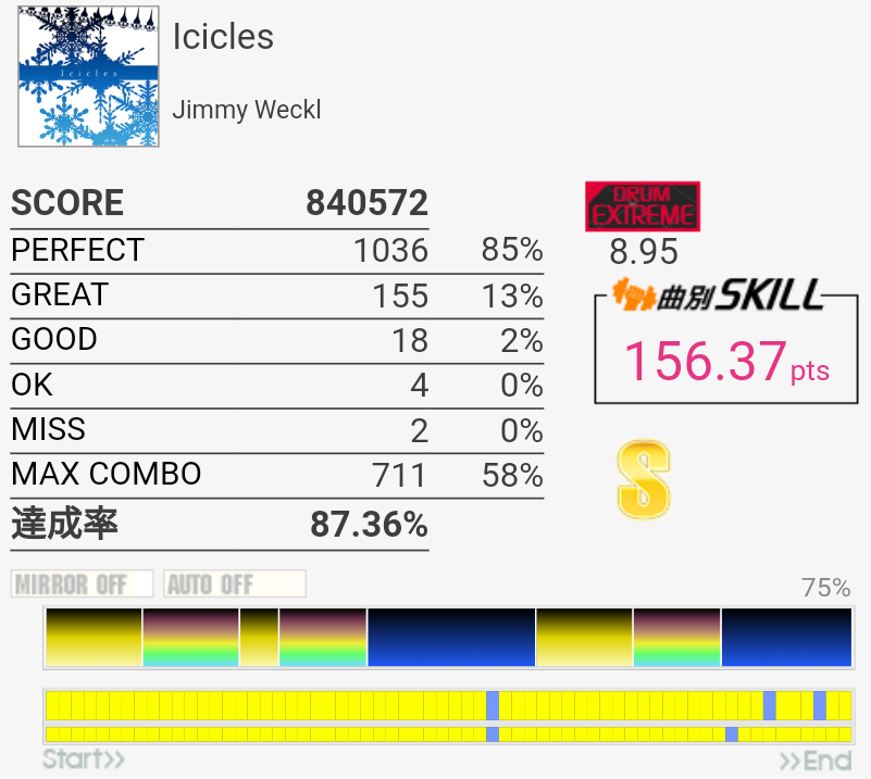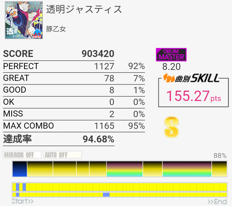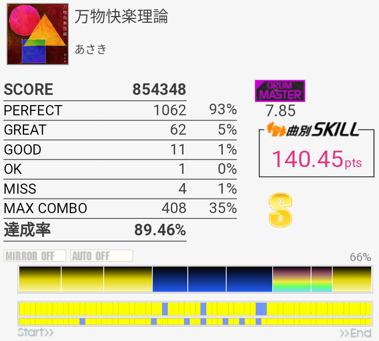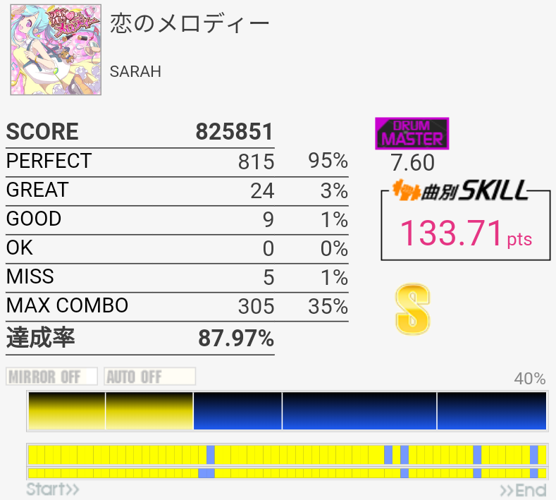 ラストのタム以外繋いだらSS取れるかな(パフェ率)。この辺の曲が8台後半にいるのは違和感しかない。