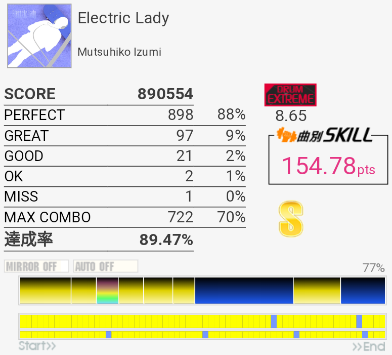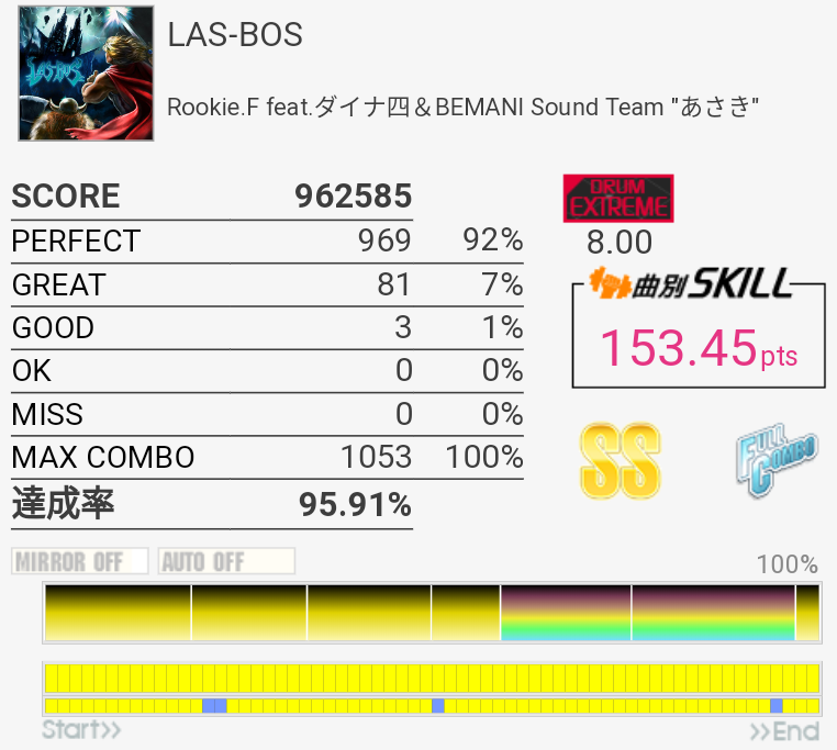 4分LP+8分BP+16分連打の部分が繋がってけっこう伸びた、パフェ率はひどい。これも三連CYができればかなり伸びるのだけれど。