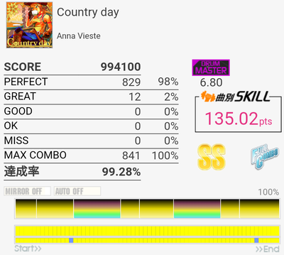 フルコン。マジで?サビ後半の手順を全然把握していないままゴリ押せちゃったのはちょっとよくない。でも嬉しい。アウトロは緊張してBPが全部GREATだった。