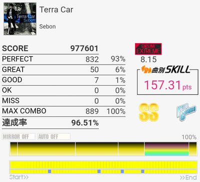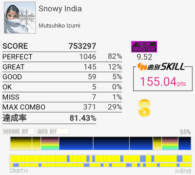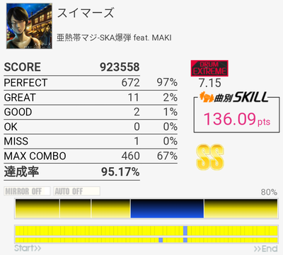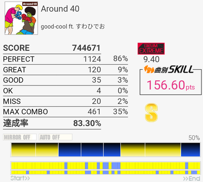 S取得。これ9台後半いってたのだな。パフェ率は置いておいて、OK-MISS数が12個というのはだいぶマシになったのでは。HH開閉のところは感覚掴めんなあ。