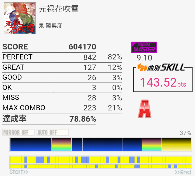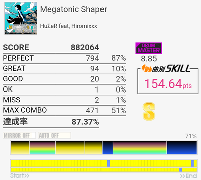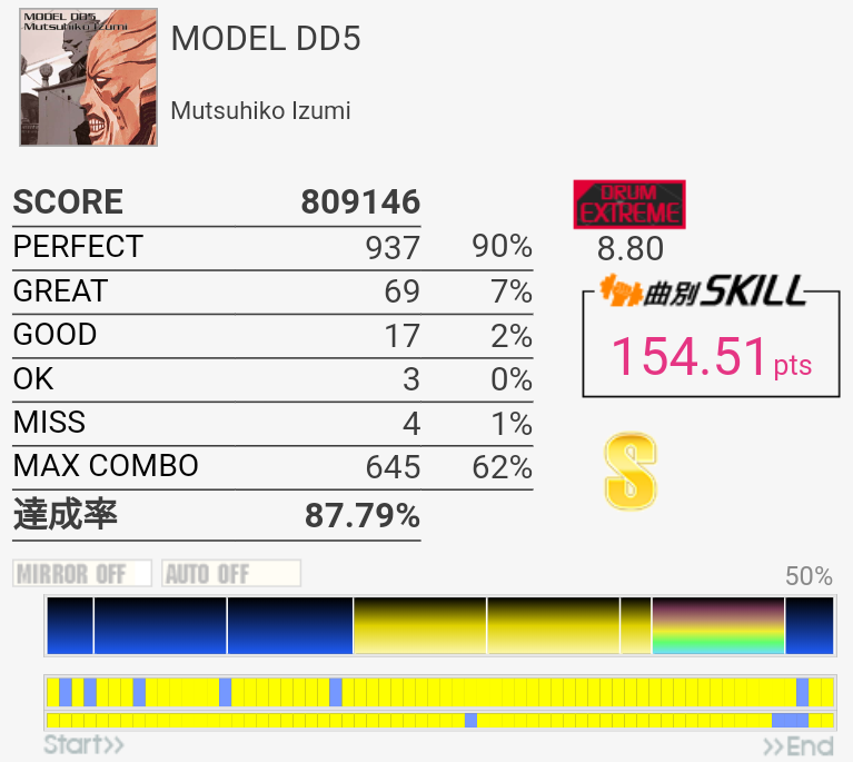 ギターの方は8分はほぼダウンしかできなくても初130点(真夏のMotion☆のMAS-B、びっくりするほど逆詐称)を取ったりでじわじわ伸びてる。単色オルタ?16分?が安定すればなー。複色は相変わらず全然見えないので明鏡止水EXT-Bのゆっくりなやつみたいな譜面ないですかね。