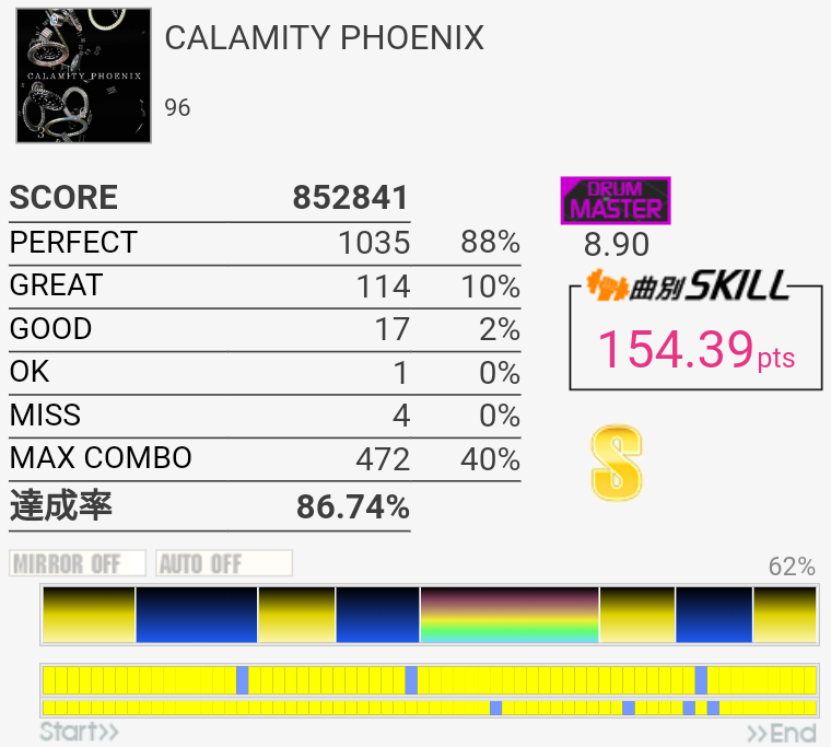 なんでサビ前の足で切ってるんですかね……ラストは調子いいとゴリ押しで繋がる、でも最近最後のFT×3の三個目が抜ける。SS取れるパフェ率じゃないと意味ないなあ。