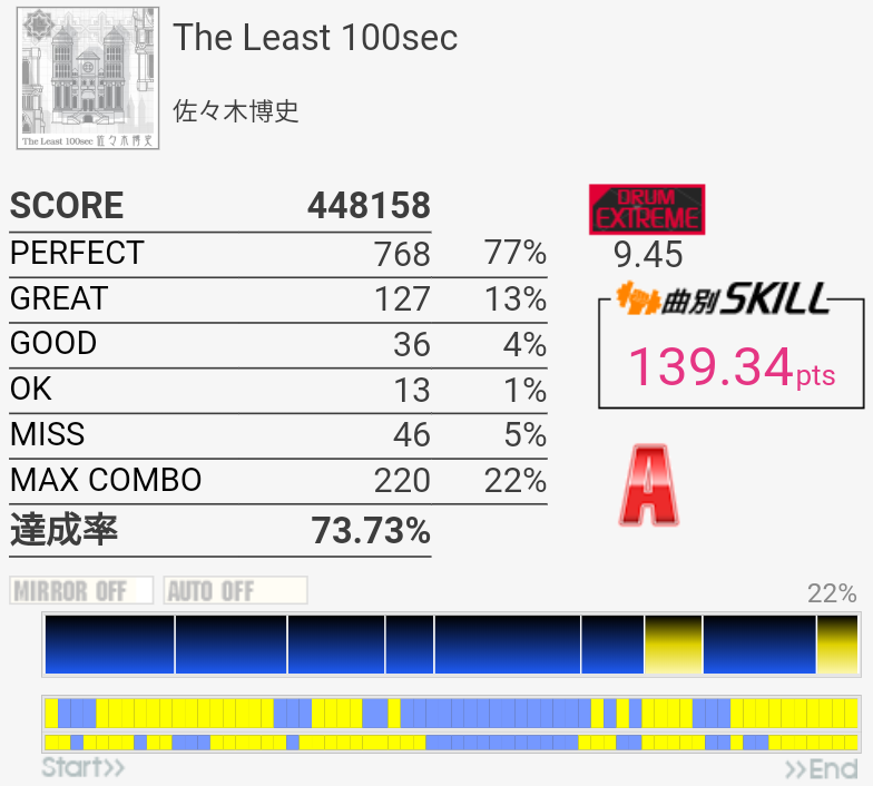 はー最初のSN打ち損じがなければ。それにしてもHH合わないなあ。ライトンからやり直しだなあ。裏LP地帯後とラストは覚えきれなくて反射で叩いているのでそこも安定しないとな。