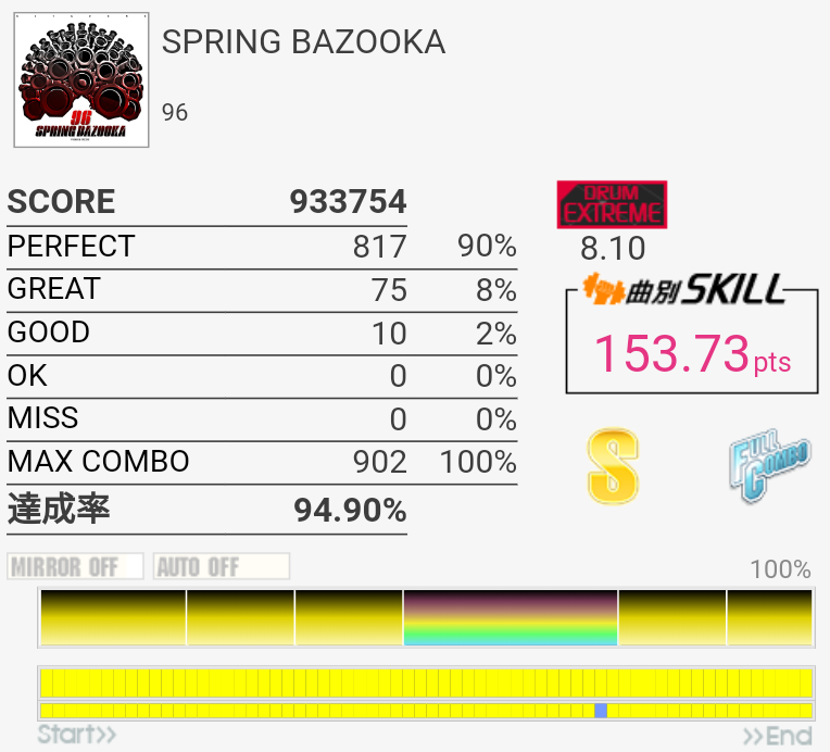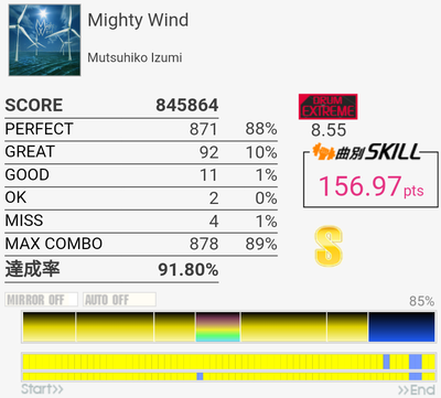 MASは左始動シンバル連打からの五連符SN×3とか三連符SN×3→16分HT×4→五連符LT×5→三連符FT×3とかSN→HT→LT→BP→SN→HT→FT→BP繰り返しとかFT→五連符SNとかいろいろ難しい。で、EXTでも難所がほぼ残ってるのがひどい。