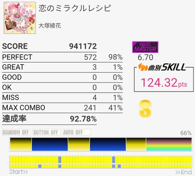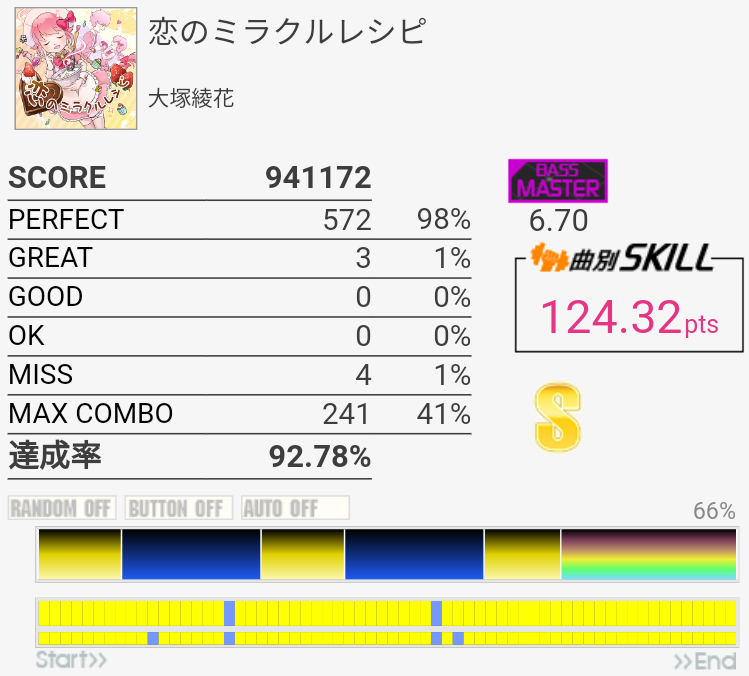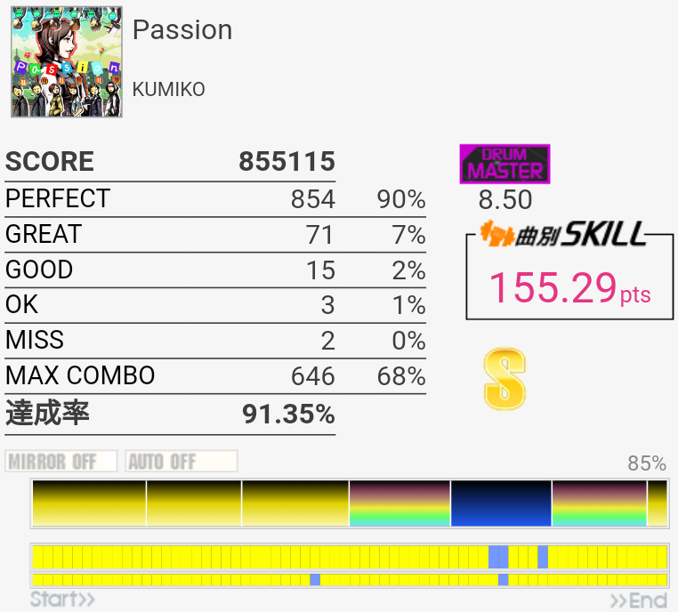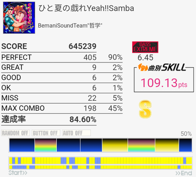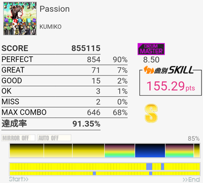 ちょい伸び。3フレーズ目の足はだいぶ安定してきた、連打で相変わらずズレるけれど。そして後半の8分LPが全然合わなくなってしまった。