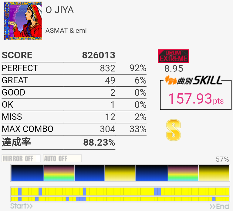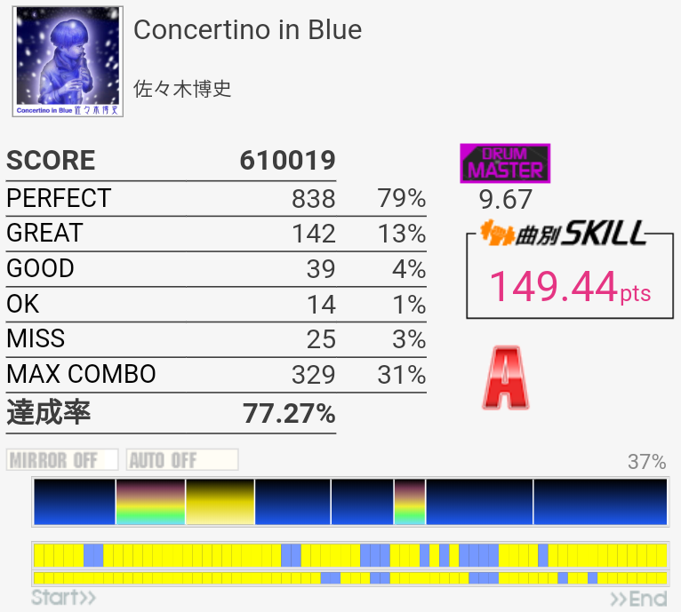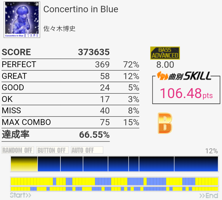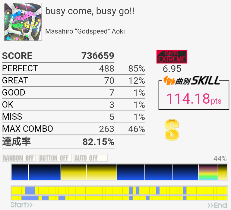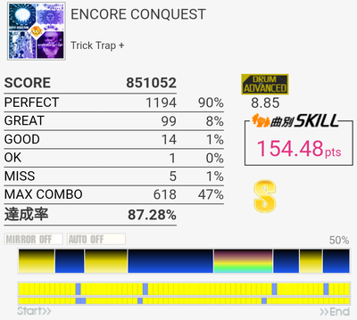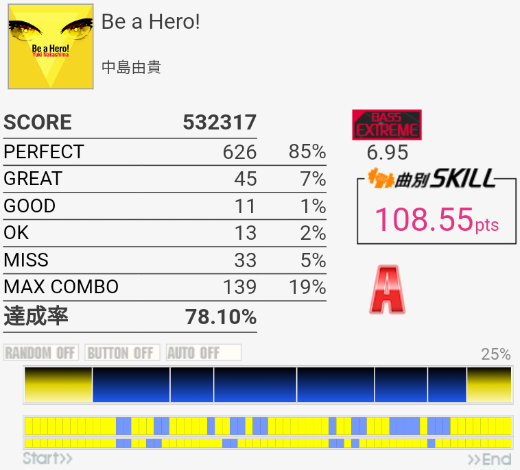 右手が疲れているのを差し引いても7台中盤くらいない?この譜面。苦手なだけかー。