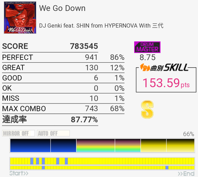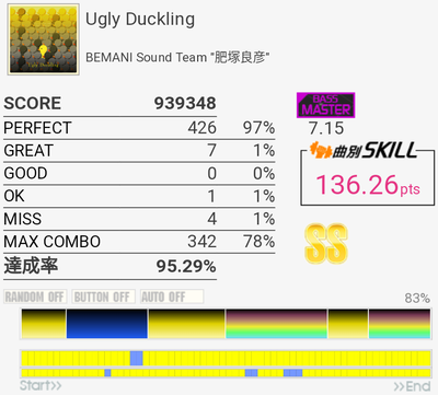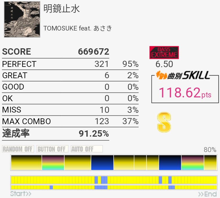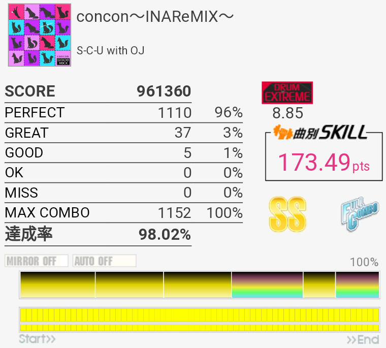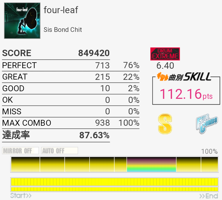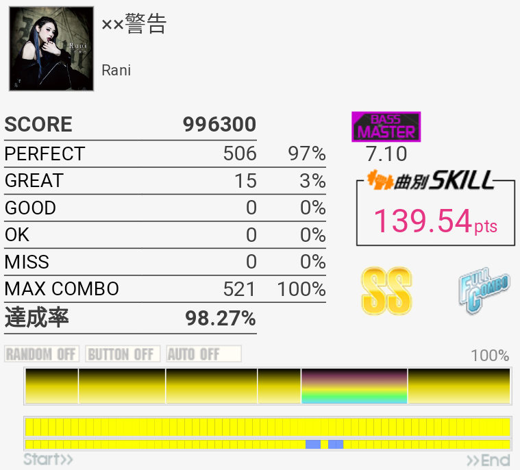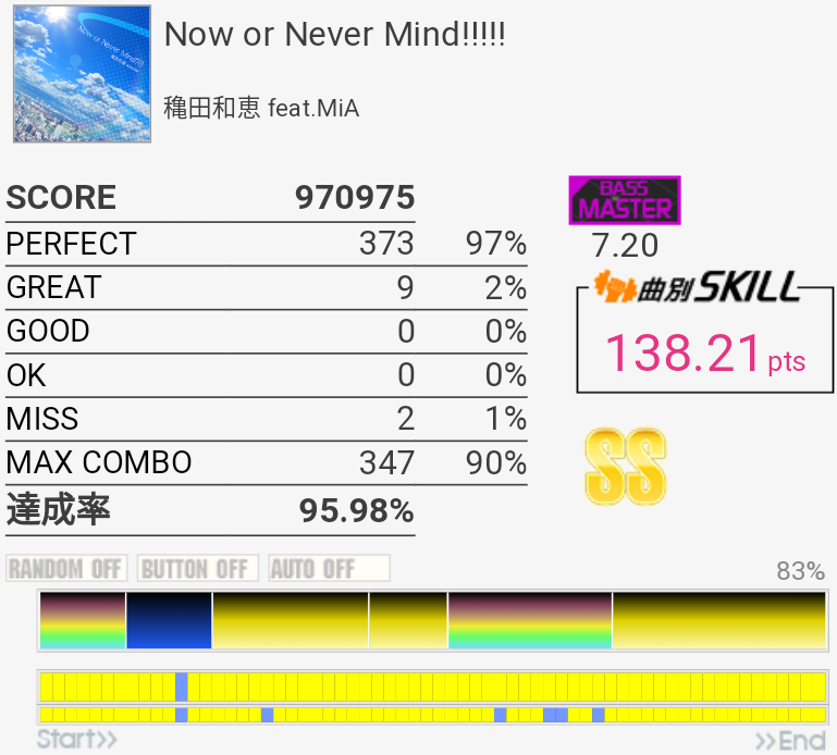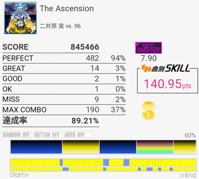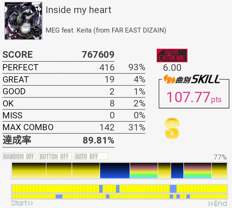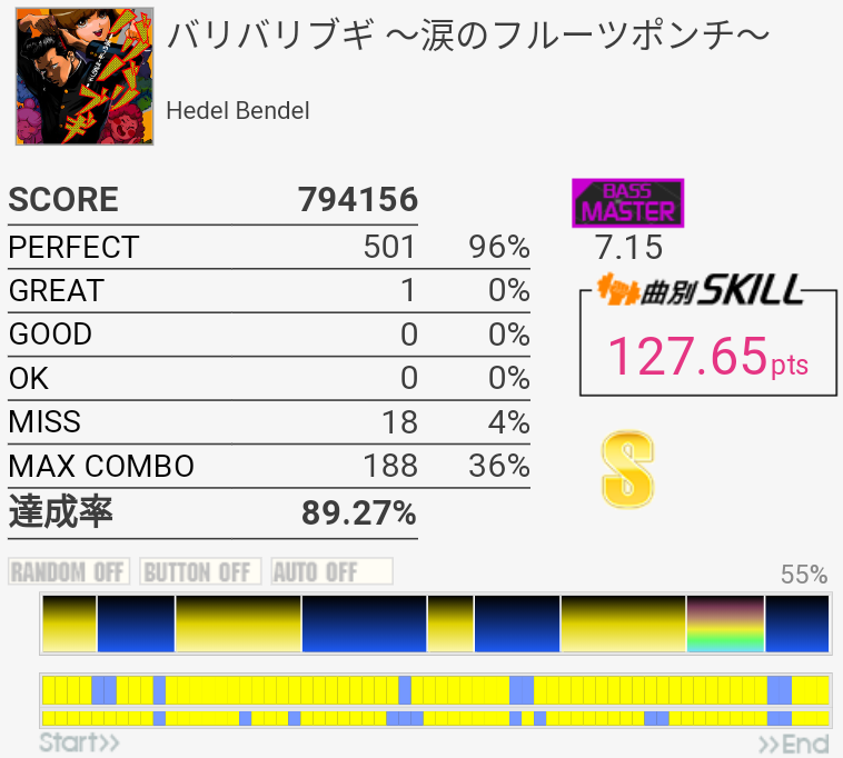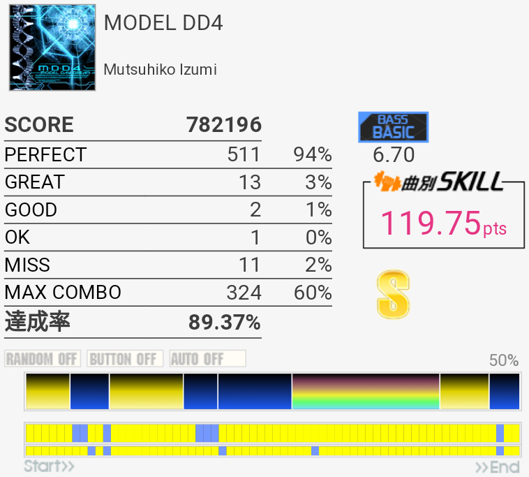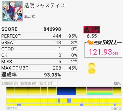 これも対象入り。プレイ中は全然意識してなかったけれどパフェ率結構いいな。うろ覚えだけれど二か所くらいY+P→B→R+Gみたいな移動があった気がしてマジ無理ってなった。