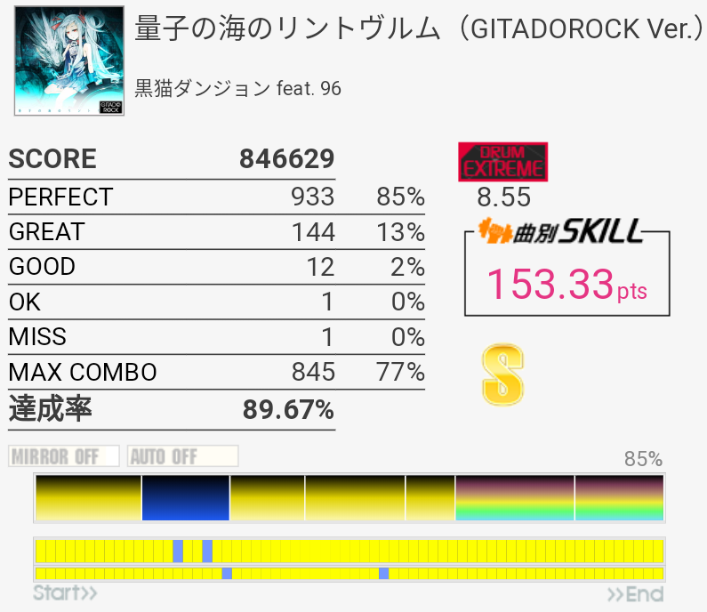 それはそれとしてこういうリザルトも出たのでよくわからんな。対象トップ。最後のツーバスでGOOD出たりで前作より達成率低いけれどしゃーなし。170点台二曲目。