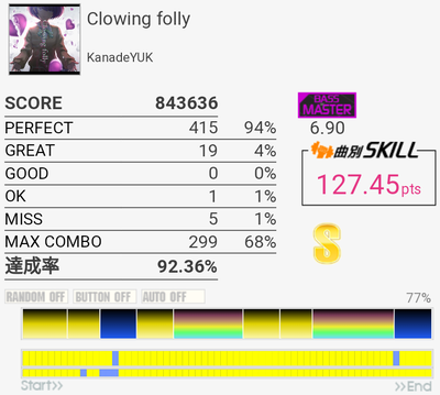 二回やったらめっちゃ伸びた。140点!ミス2つともYの押さえミスなので繋げられますね。赤グラ決め手。