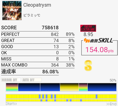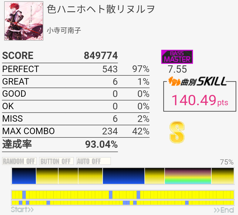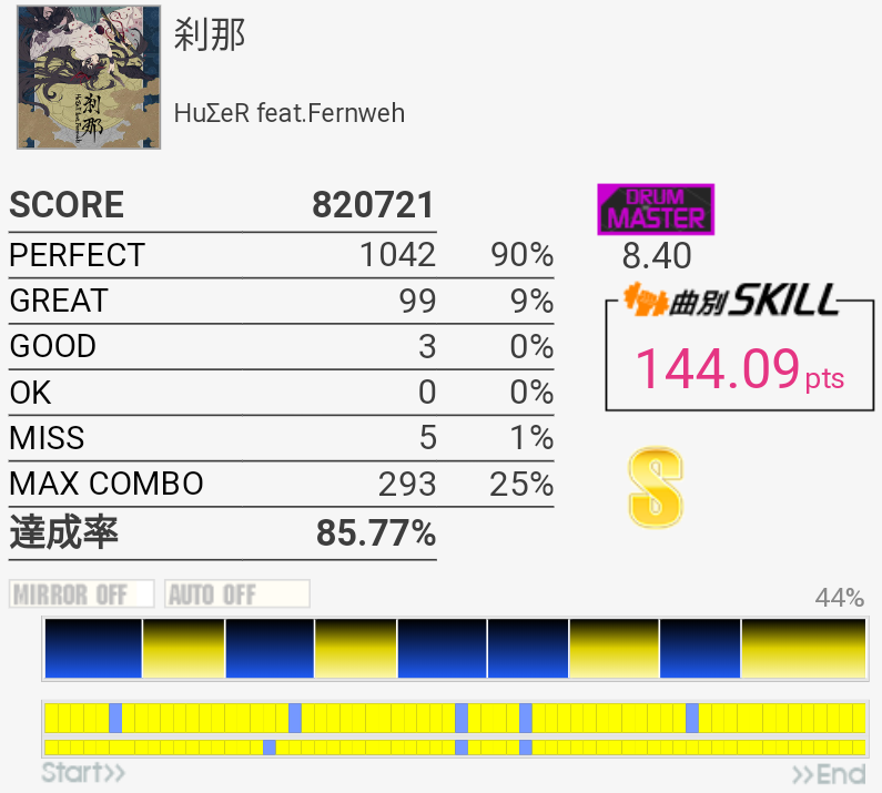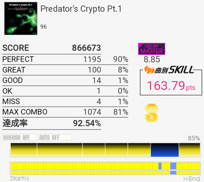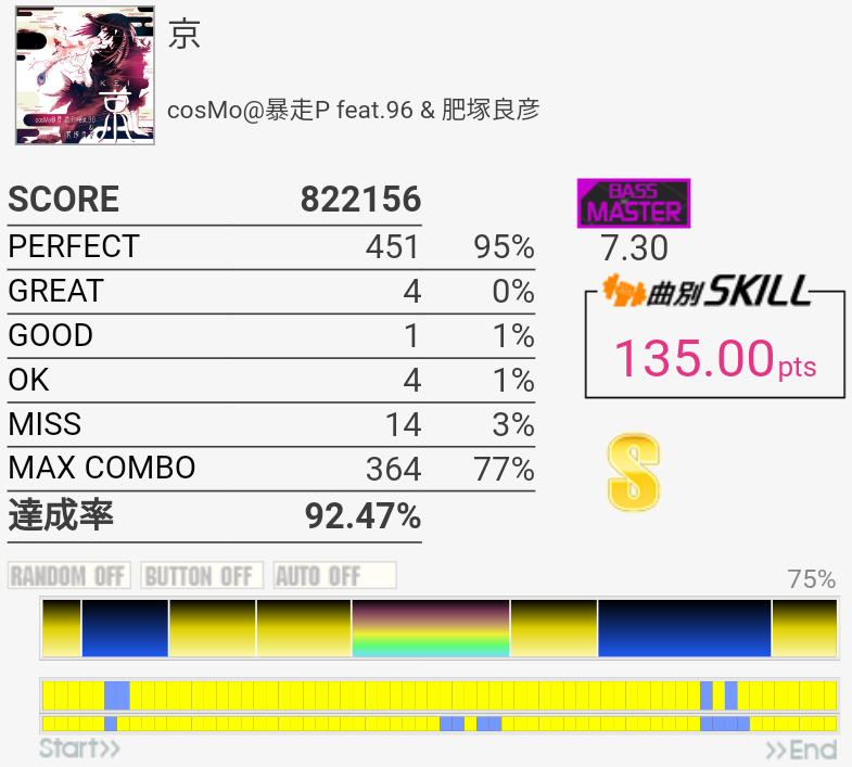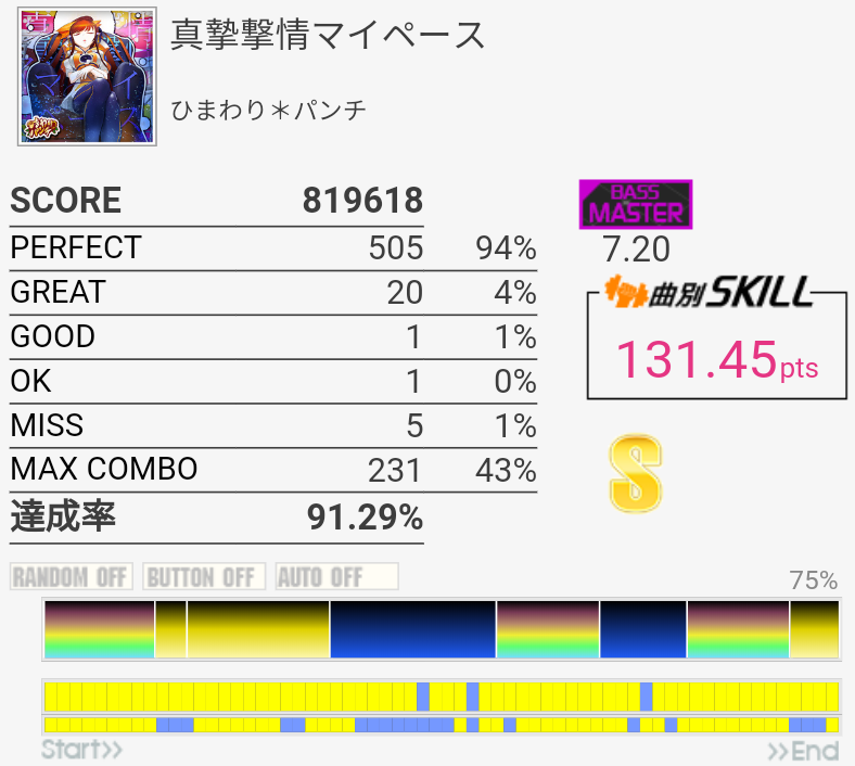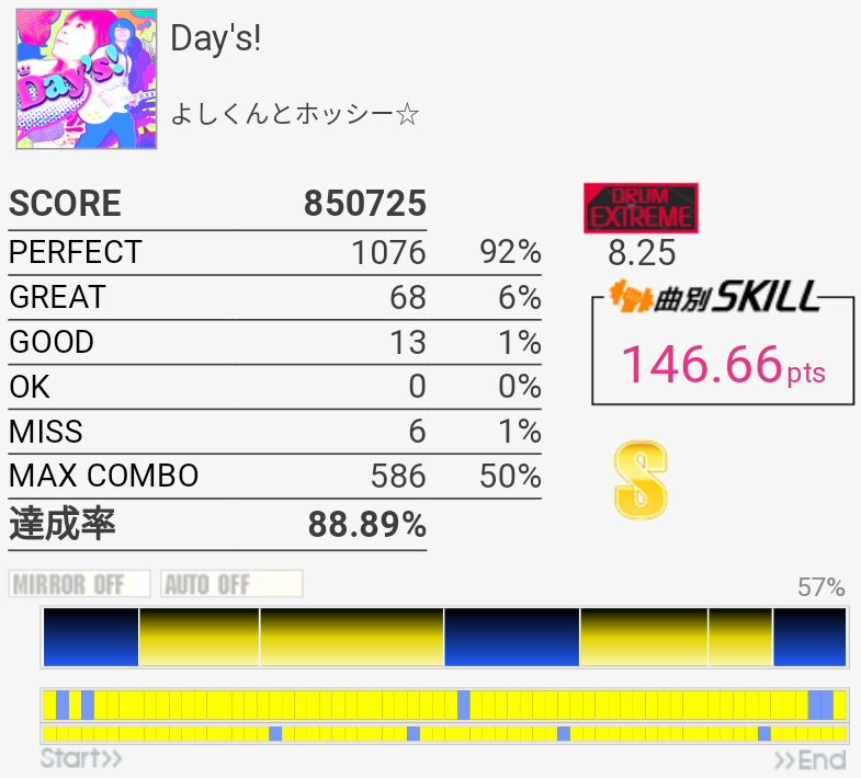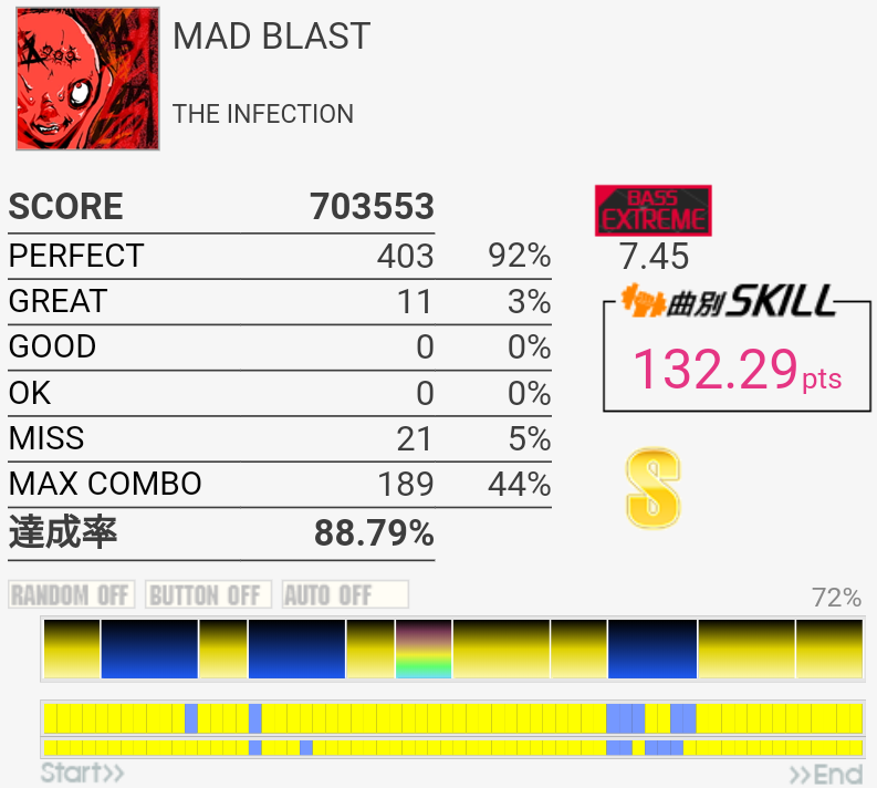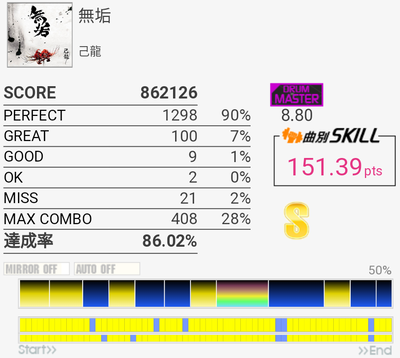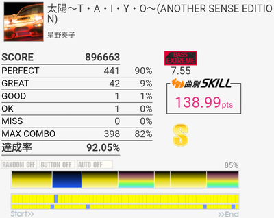 A判定→S判定。複色→単色の繰り返しは苦手なので今度はこれをフルコン目指す感じか。ドラムが気持ちいいところの三連符は次はできるかな、どうかな。