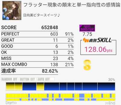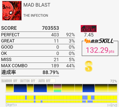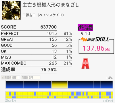 A判定→130点。ミスったところちゃんと押せてたと思うのだけれどなあ。他の曲でもBとY絡みでそういうMISSがいくつかあった。間違えて押してたのかな。