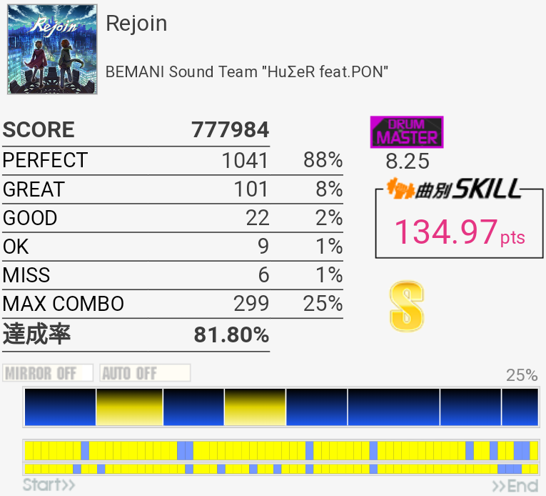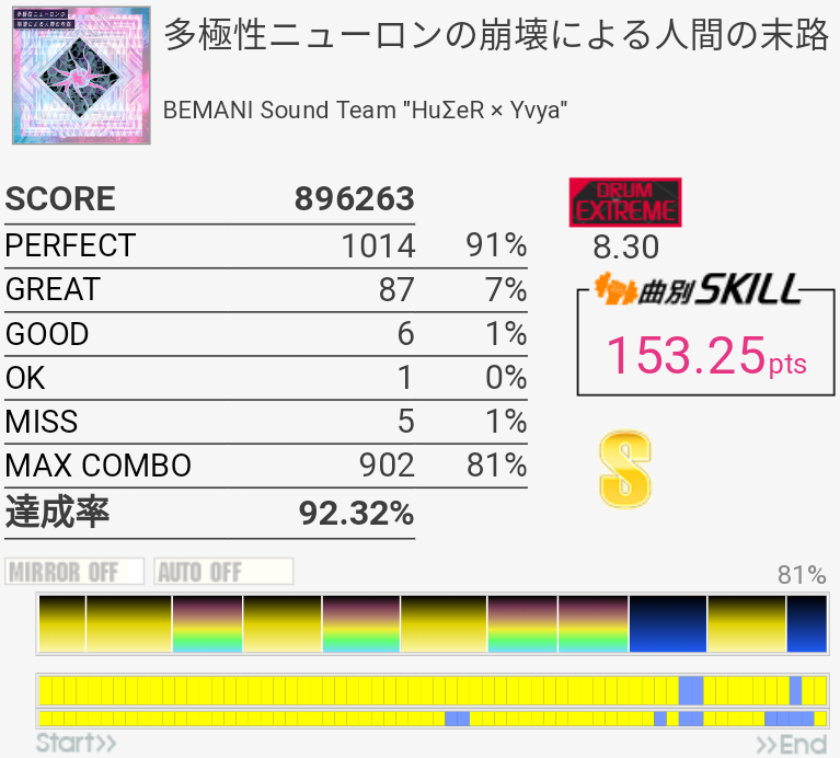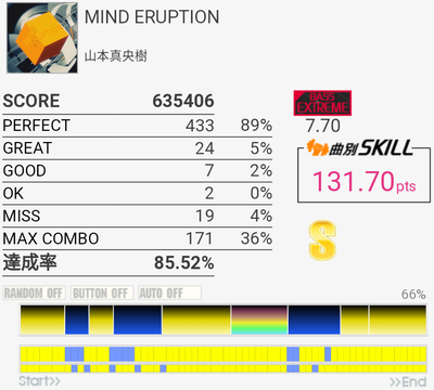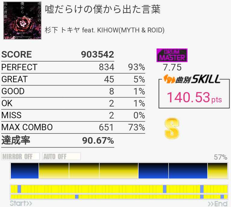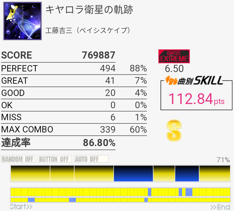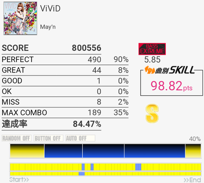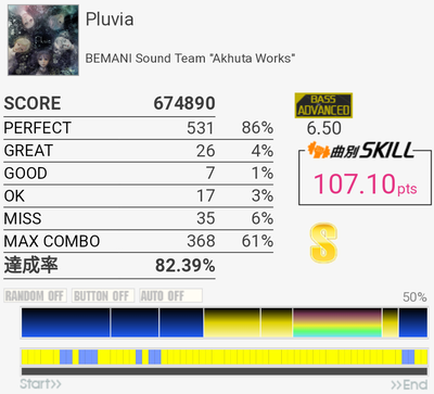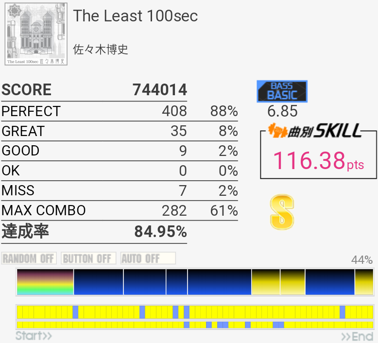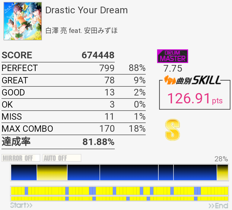 イントロがフラム抜けた以外繋がったのがびっくり。手の速度がハマっていてなんか不思議な感覚だったな。それだけに後半でミスったのがもったいない。