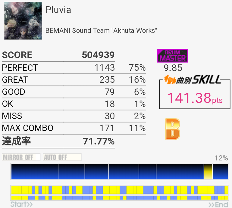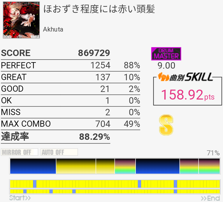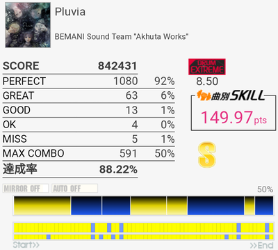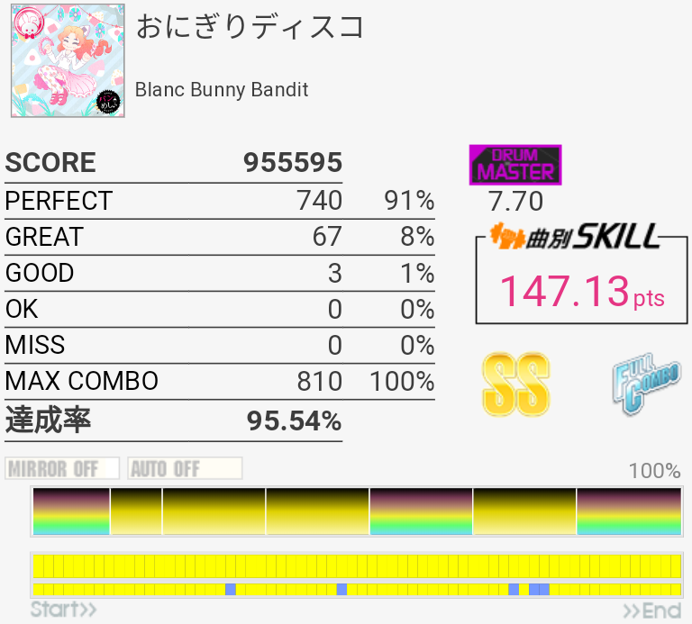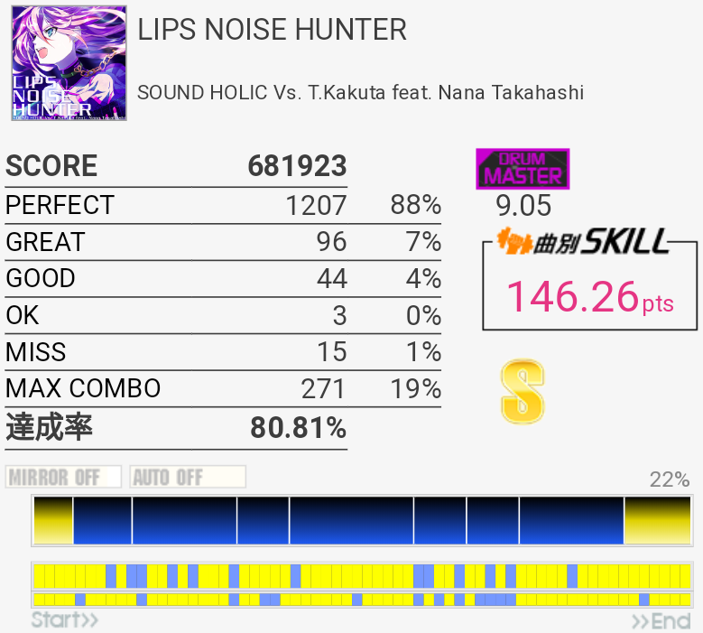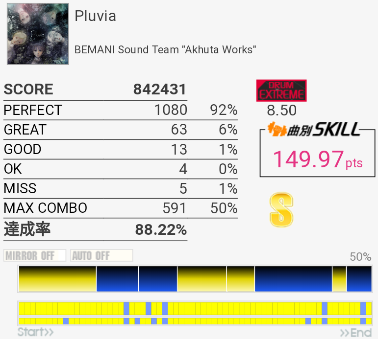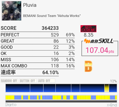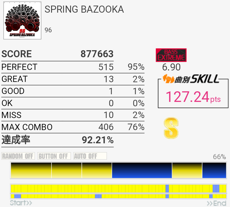 イントロがフラム抜けた以外繋がったのがびっくり。手の速度がハマっていてなんか不思議な感覚だったな。それだけに後半でミスったのがもったいない。