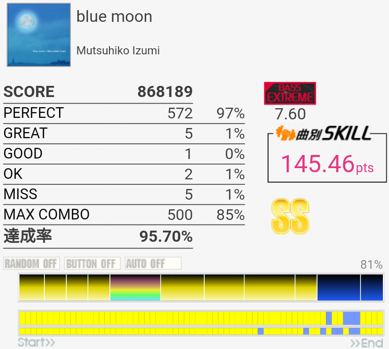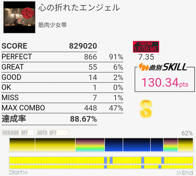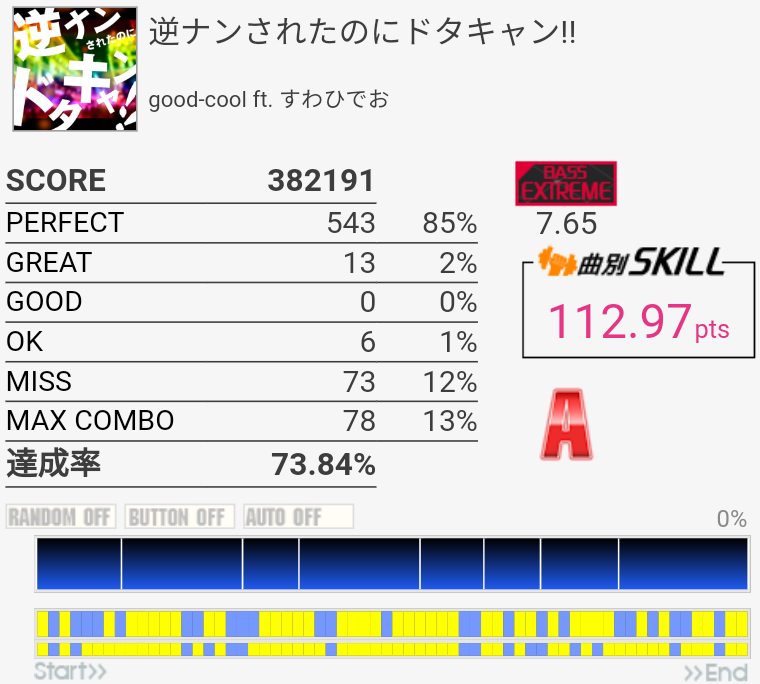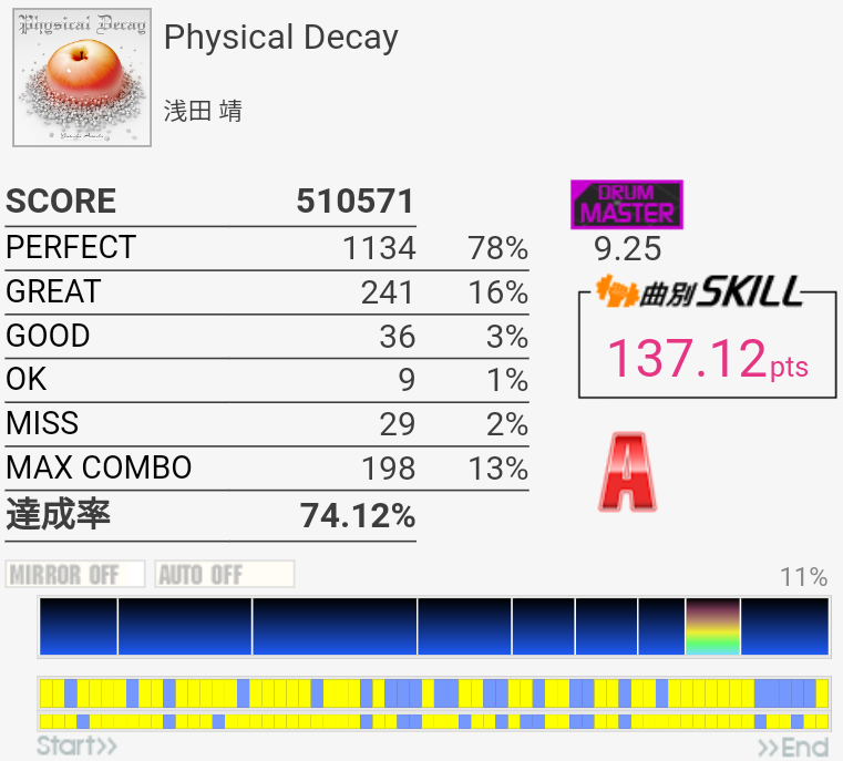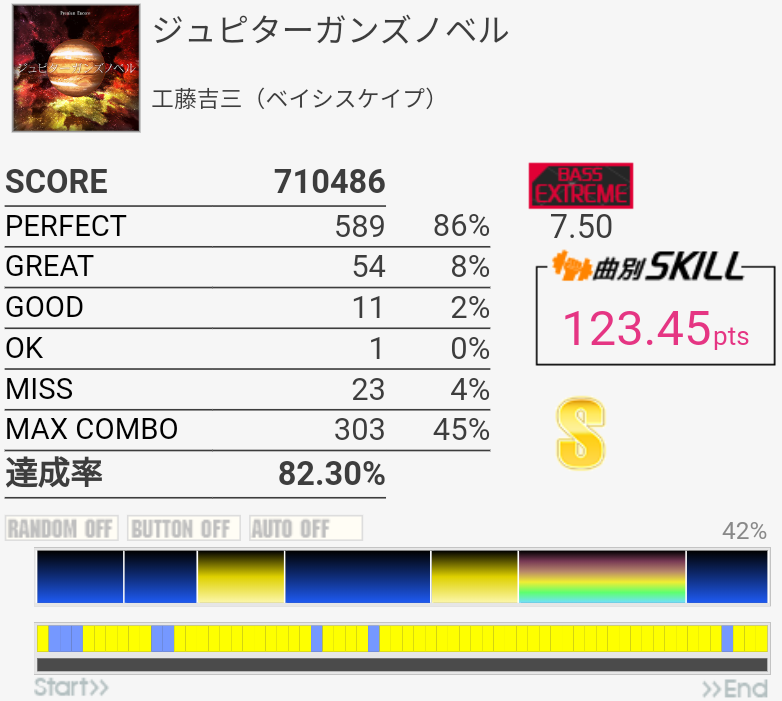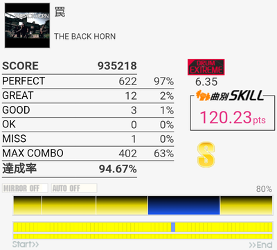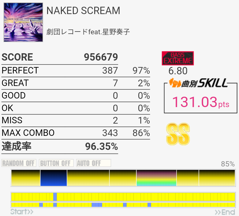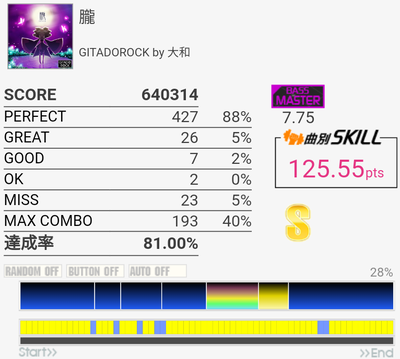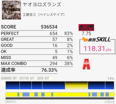 久しぶりにやってみたらちょい伸び。MISS数は思ったより少ない。ツーバスがズレまくってた。